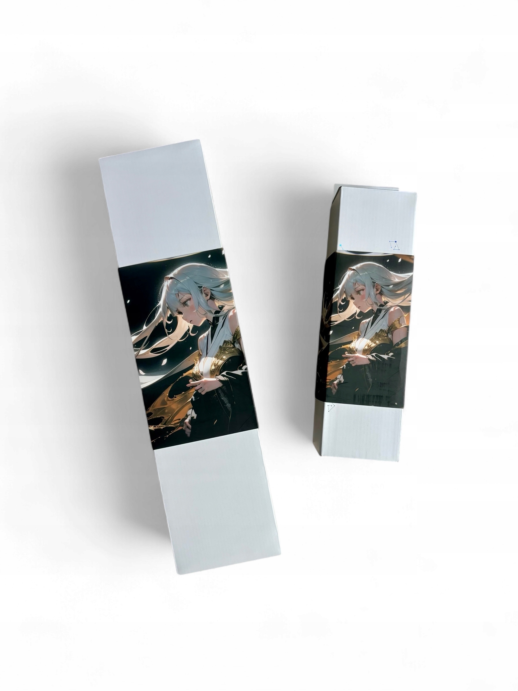 - Графический мотив: персонаж с длинными, серебристыми волосами и золотыми деталями