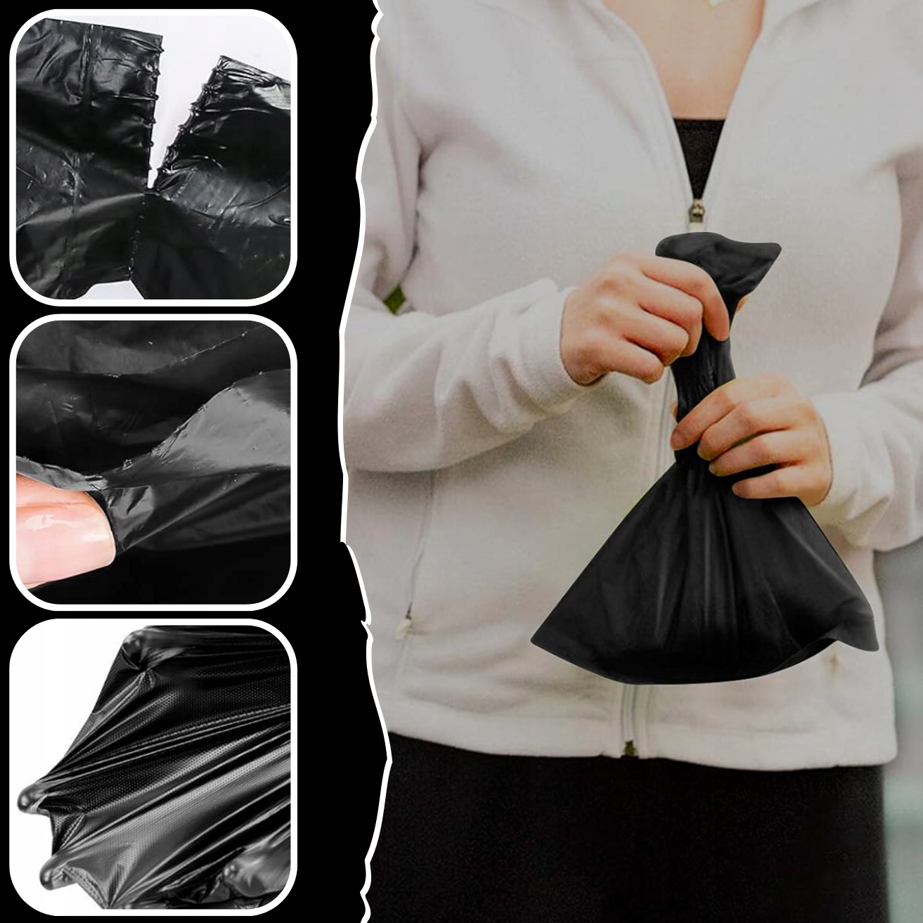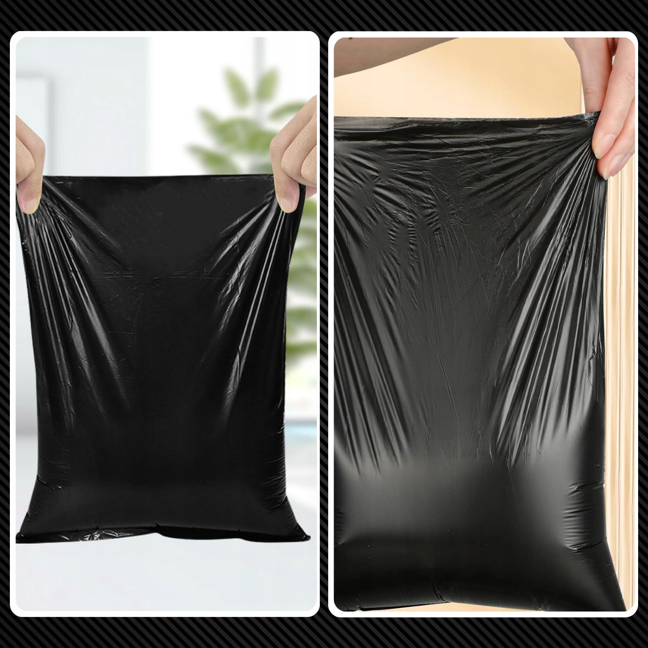 - ОНИ НЕ ПРОЗРАЧНЫЕ - пакеты такие. черный, поэтому вы не можете видеть их содержимое. Они большие, толстые и достаточно прочные, поэтому не протекают и не ломаются.