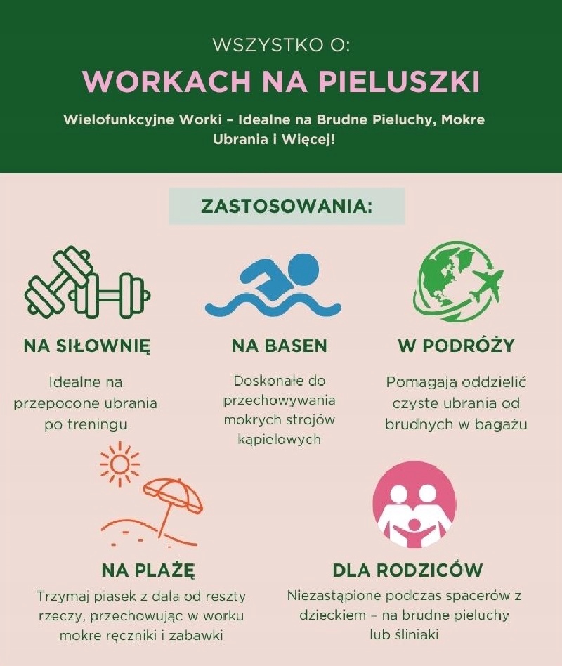 Идеально идеально как сумка для многоразовых подгузников, так и для грязной или влажной детской одежды, купальников, полотенец и спортивной одежды. Полезно при путешествии, в бассейне, ходьбы или во время повседневных мероприятий.