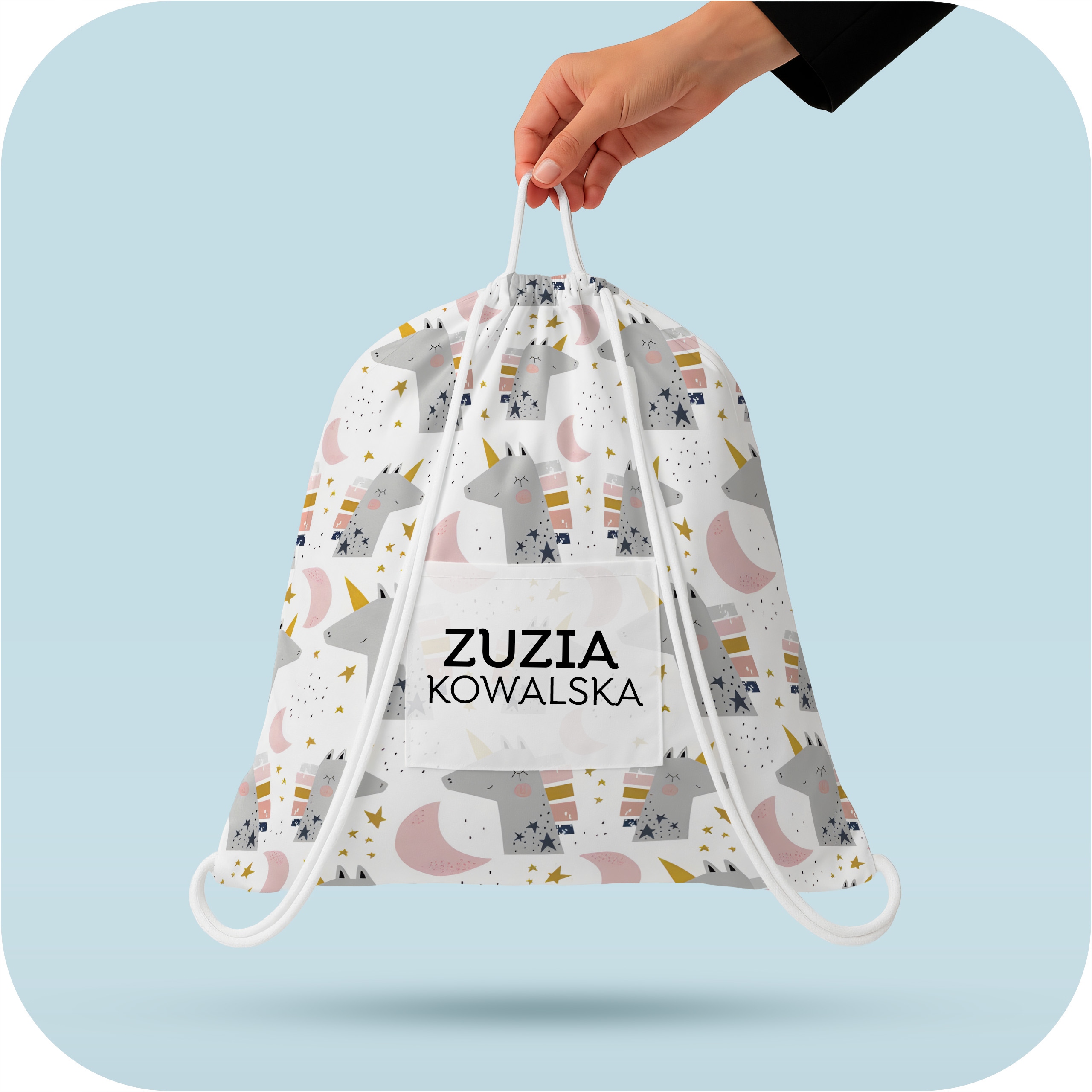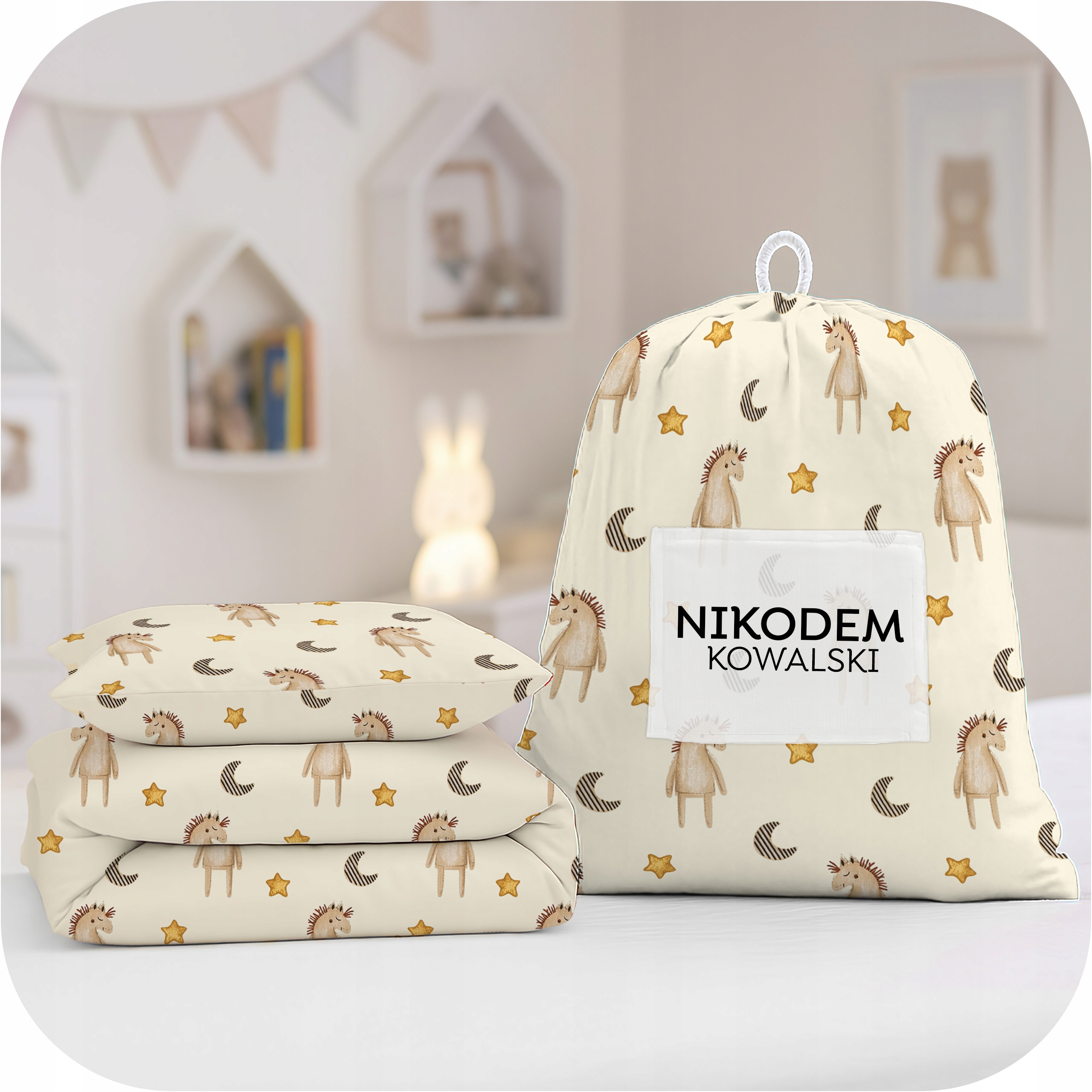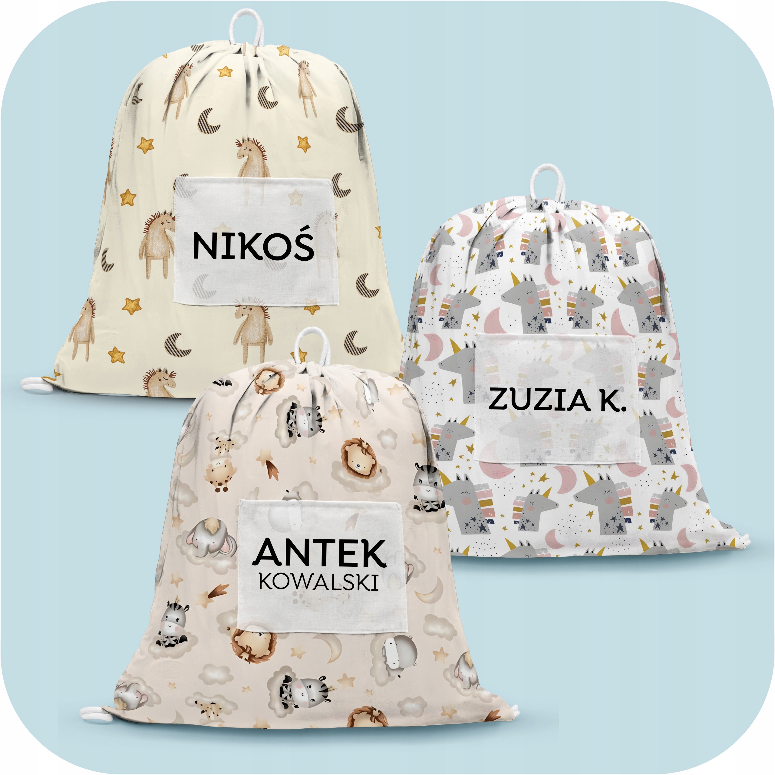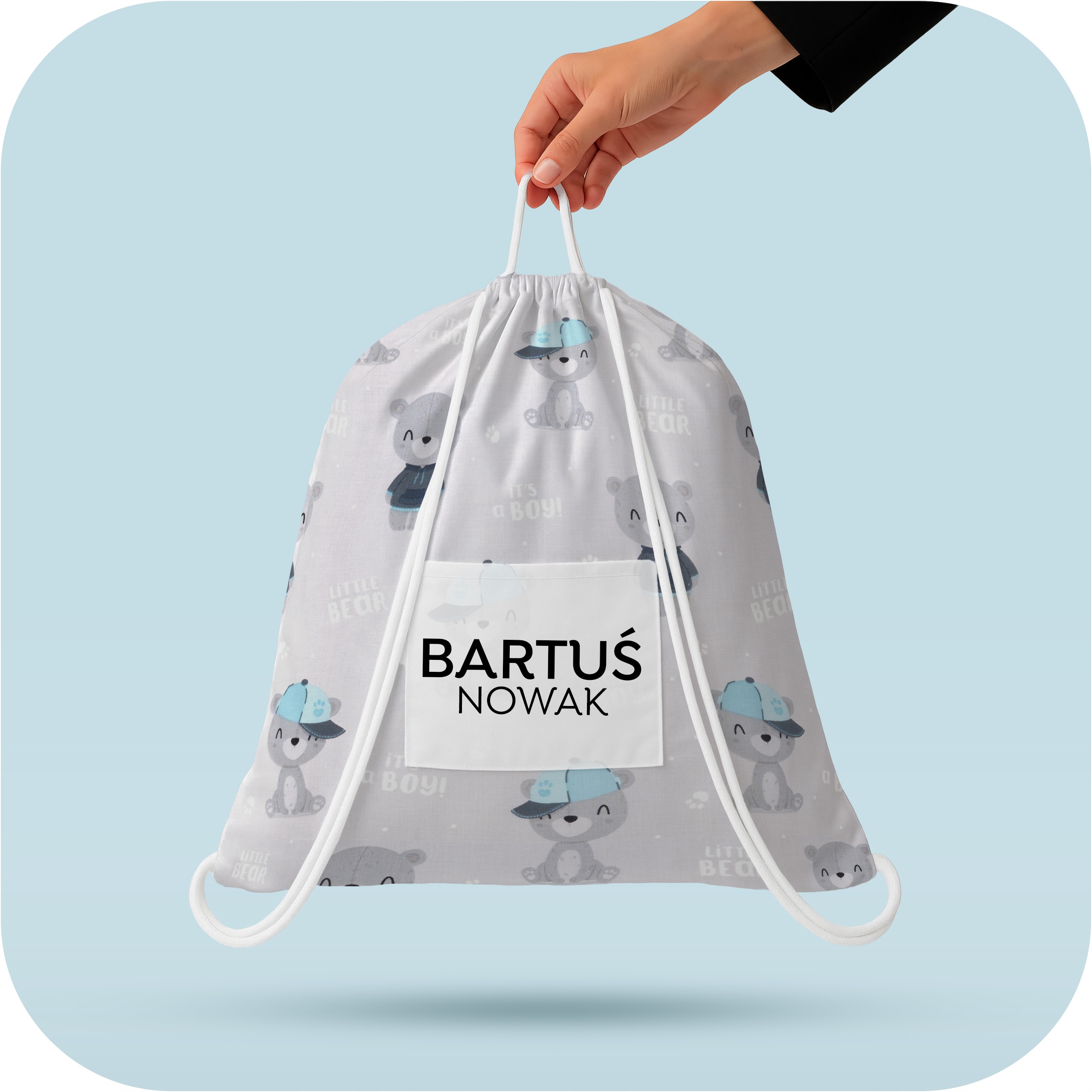 На передней части есть белый карман для персонализации - мы можем распечатать имя, имя и первую букву фамилии или полное имя ребенка. Сумка продается отдельно, без постельных принадлежностей.