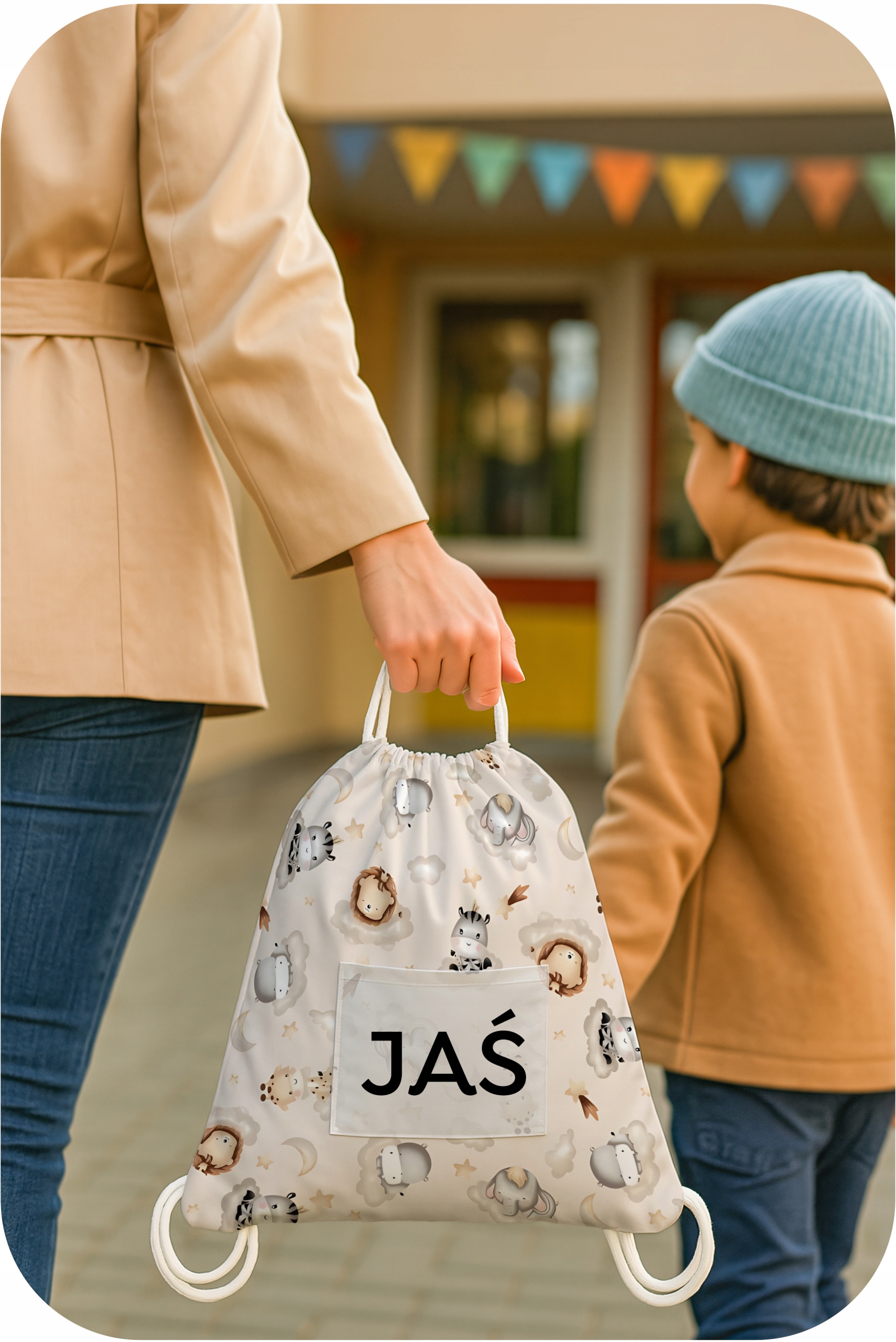 Сумка имеет размер 50x60 см , благодаря которому он может легко установить целый набор детских постельных принадлежностей с подушкой. Это также будет работать как сумка для одежды, пижамы или других вещей для детского сада. Он легкий, но очень прочный - создан для ежедневного использования. является незаменимым элементом детского сада или детского сада.