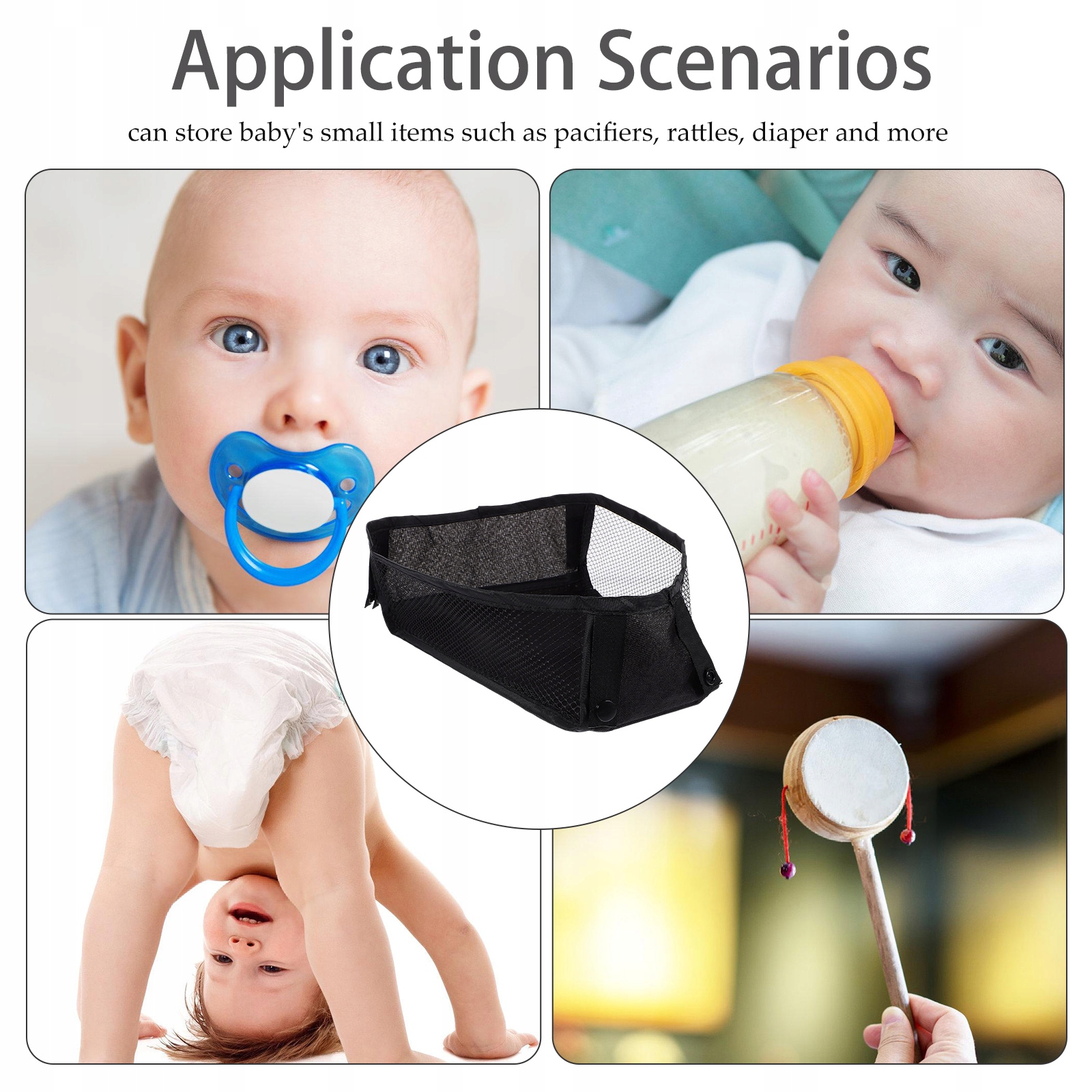✅. Нижняя сумка для хранения коляски прост в установке и может хранить маленькие детские объекты, такие как соски, гремучие, подгузники и другие Проще говоря, он может быть прикреплен к PRAM, удобным и полезным для соски для хранения для ребенка, подгузников за подарок
