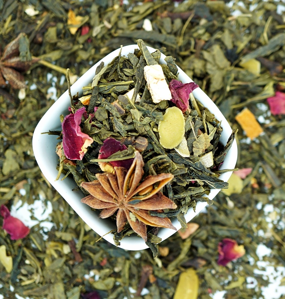 РОЖДЕСТВЕНСКИЙ ВЕЧЕР 50 г – состав: зеленый чай Сенча, апельсин, миндаль, гвоздика, корица, лепестки роз, клубника, малина, анис.