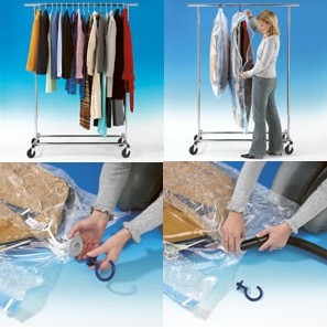 Целая стопка одежды уменьшается в объеме в четыре раза, если ее поместить в вакуумный пакет! Вместо переполненных шкафов и полок вы получаете порядок и много места! Одежда, хранящаяся без доступа воздуха, дольше выглядит новой! Просто используйте обычный пылесос.