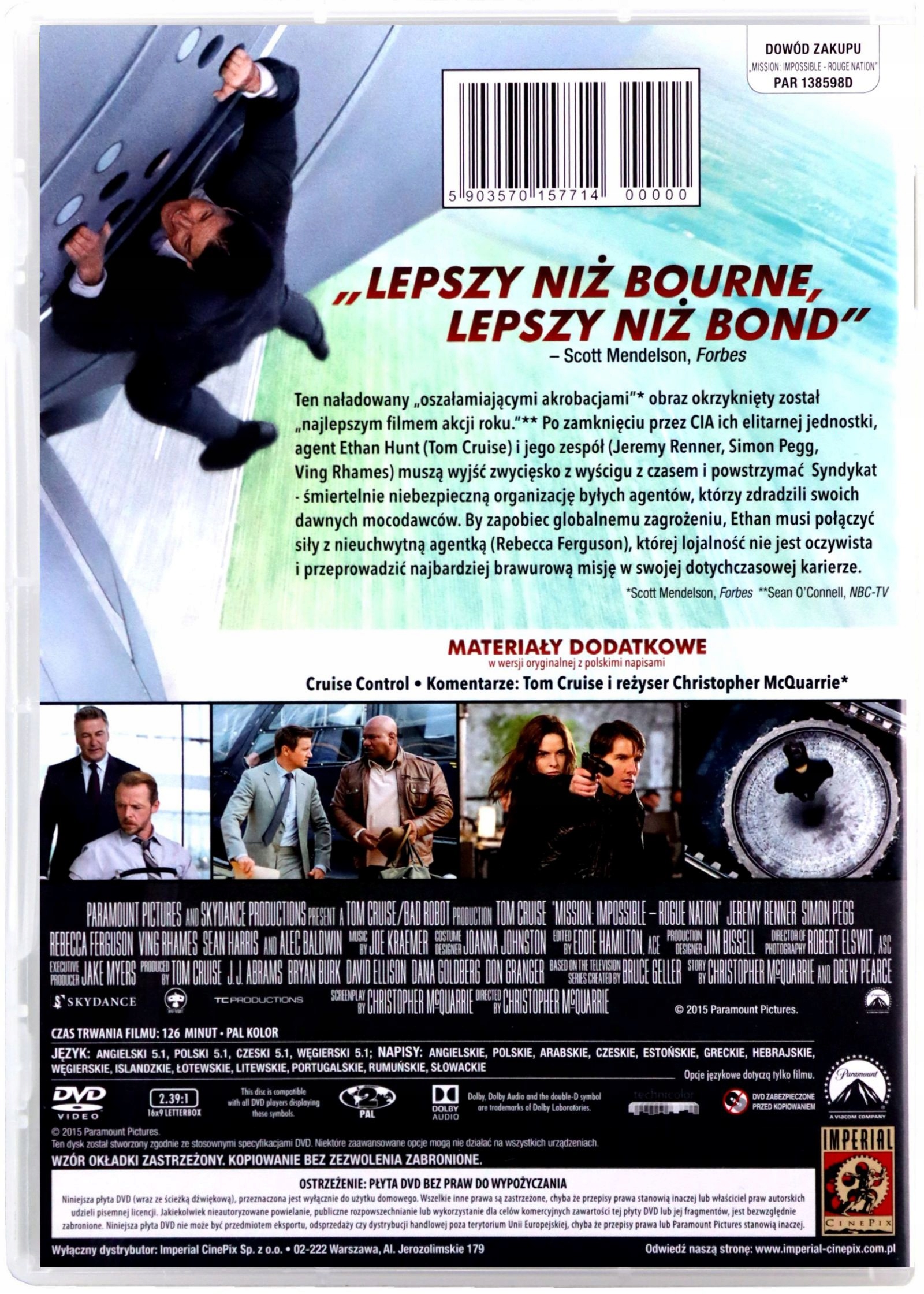 Наполненная «потрясающими трюками»*, эта картина была названа «лучшим боевиком года».** Несмотря на то, что ЦРУ закрыло свое элитное подразделение, агента Итана Ханта (Том Круз) и его команда (Джереми Реннер, Саймон Пегг, Винг Рэймс) пытаются выиграть гонку со временем и остановить Синдикат — смертоносную организацию бывших агентов, предавших своих бывших руководителей. Чтобы предотвратить глобальную угрозу, Итан должен объединить усилия с неуловимым агентом (Ребекка Фергюсон), лояльность которого не очевидна, и выполнить самую смелую миссию в своей карьере.