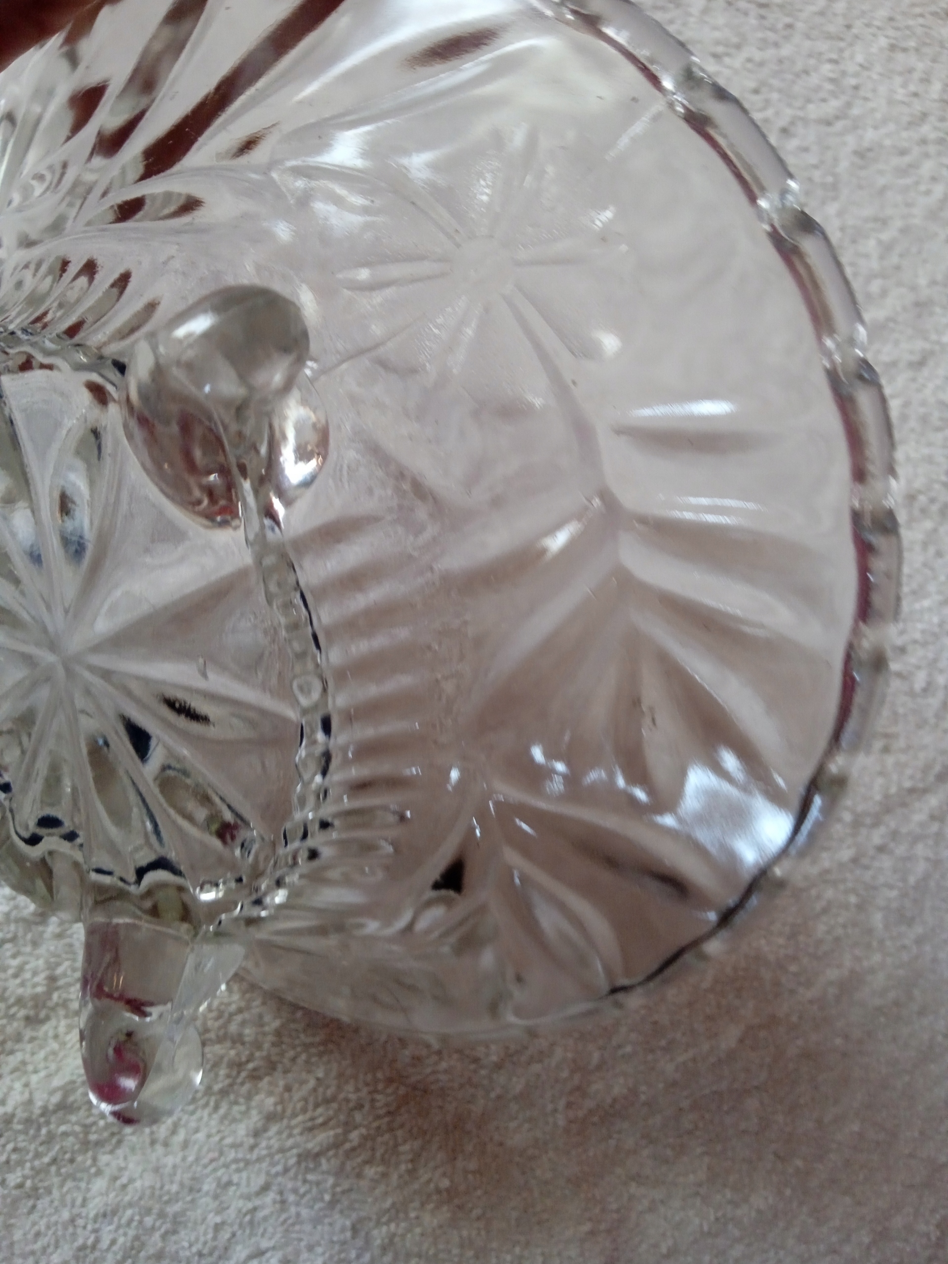 Продаю миску - салатницу из прозрачного прессованного стекла производства Walther Glas. Чаша с цветочным узором, зубчатый край, розетка внизу. Дно чаши поддерживают три ножки, свернутые в виде раковины улитки. Высота 8,4 см. Диаметр 21,4 см. Диаметр дна 9,4 см. Блюдо 1940-х годов, состояние хорошее. В массе присутствуют небольшие пузырьки воздуха и множество крошечных дефектов. На ободе не очень заметные, но ощутимые технологические микробрызги, образовавшиеся при снятии сосуда с пресса и не шлифовке.