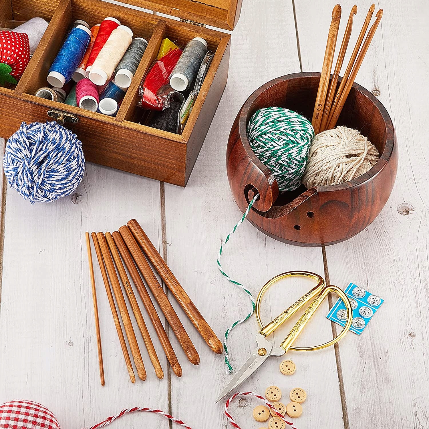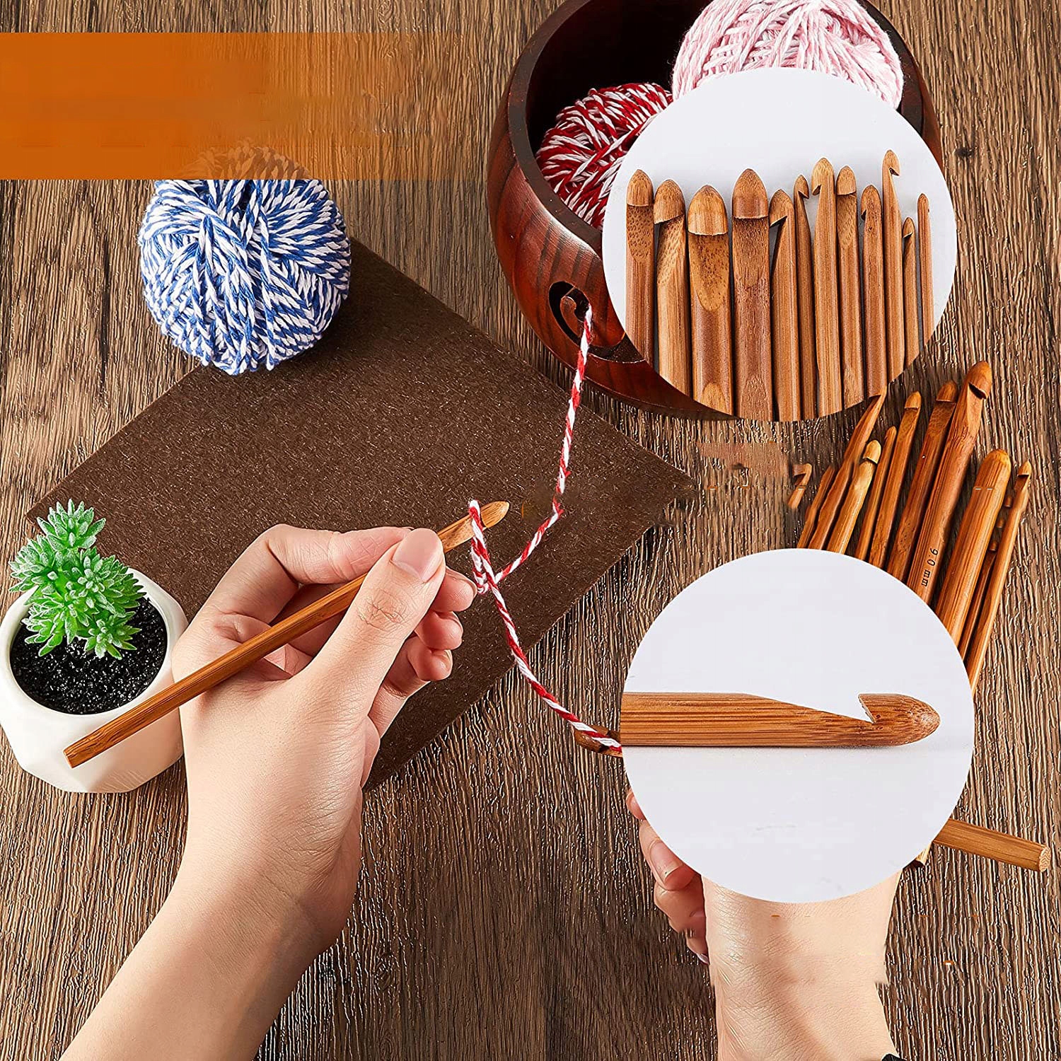 🧶 【Содержимое упаковки】: Вы получите деревянную миску для пряжи, достаточно маленькую, чтобы ее можно было носить, и 12 бамбуковых крючков для вязания крючком. В разных размерах, гладкие и легкие, их можно использовать часами пользователями, страдающими болями в суставах или артритом.