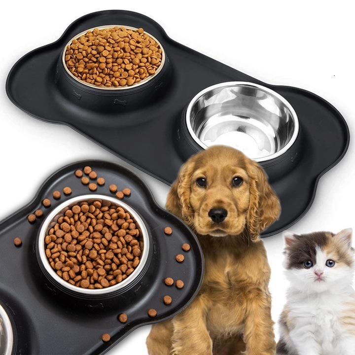 МИСКА ДВІЙНА СИЛІКОНОВА ДЛЯ СОБАКИ І КІШКИ, МЕТАЛЕВА, ПРОТИСКЛИЗКА, 2х175мл Килимок