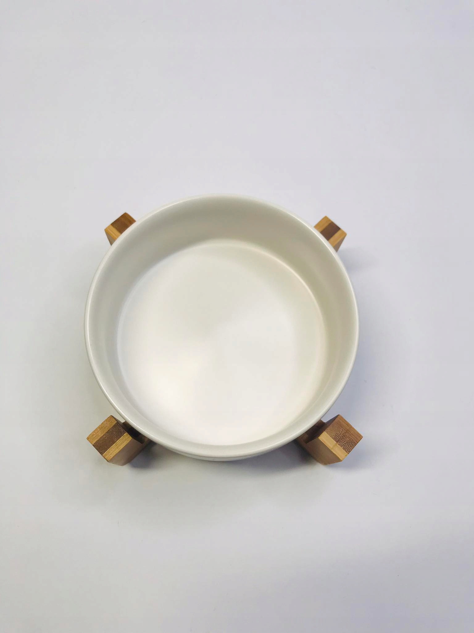 Белая керамическая миска для домашних животных, миска для собак и кошек с подставкой из массива дерева.