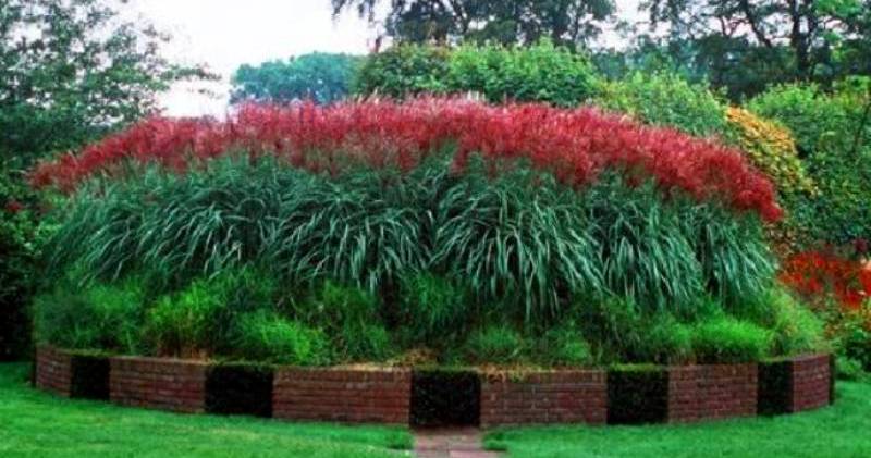 Міскантус в кратері компактні купки з червоним пір'ям