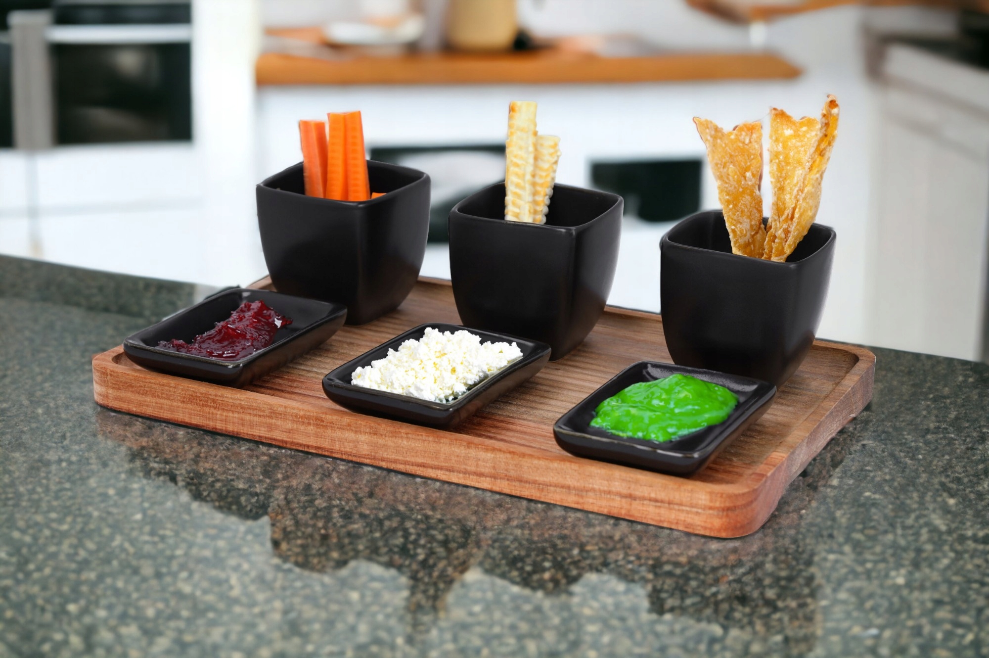 ✅ Элегантный набор — набор из шести матовых черных керамических мисок, идеально подходящих для подачи закусок, помещенных на стильный поднос из дерева акации. p >