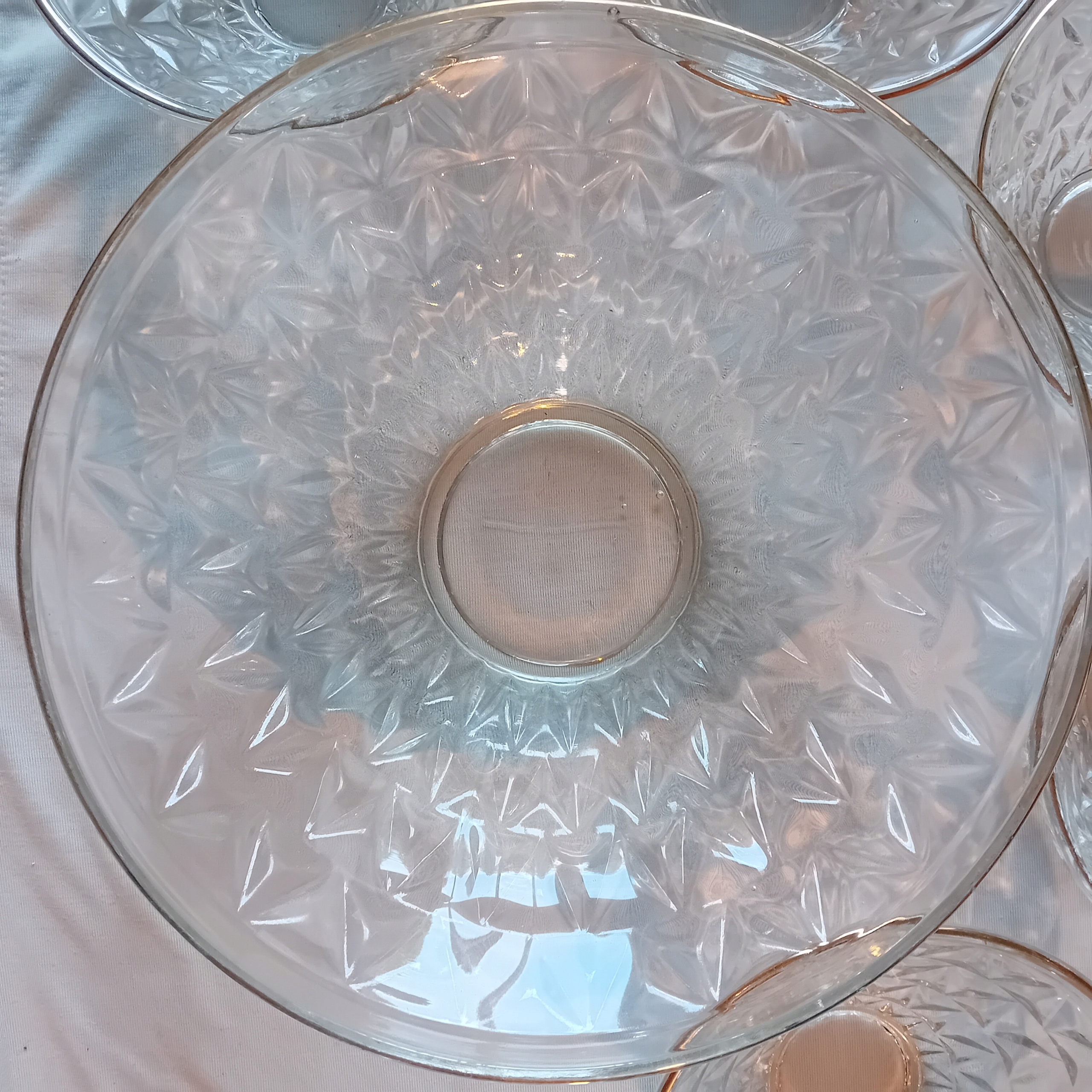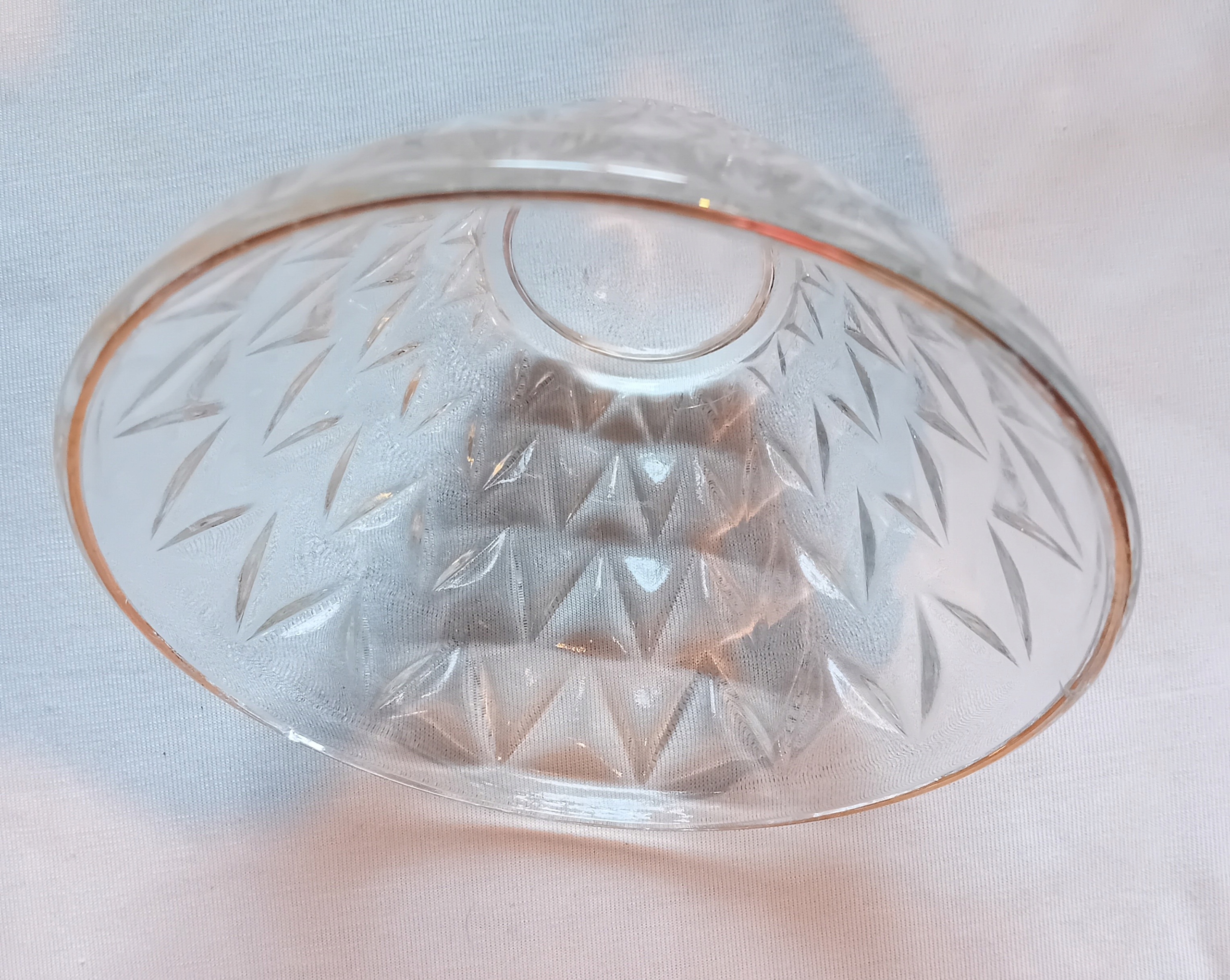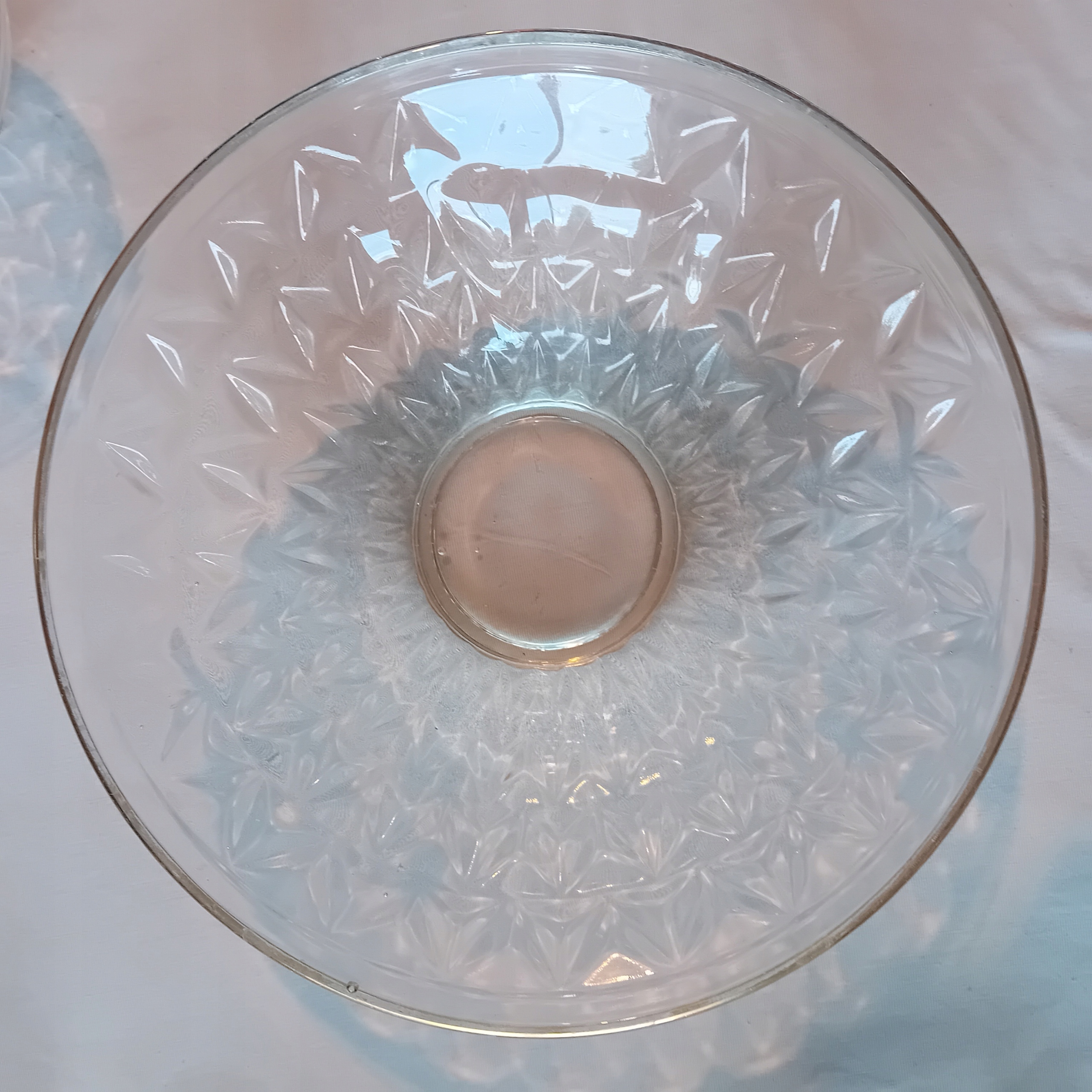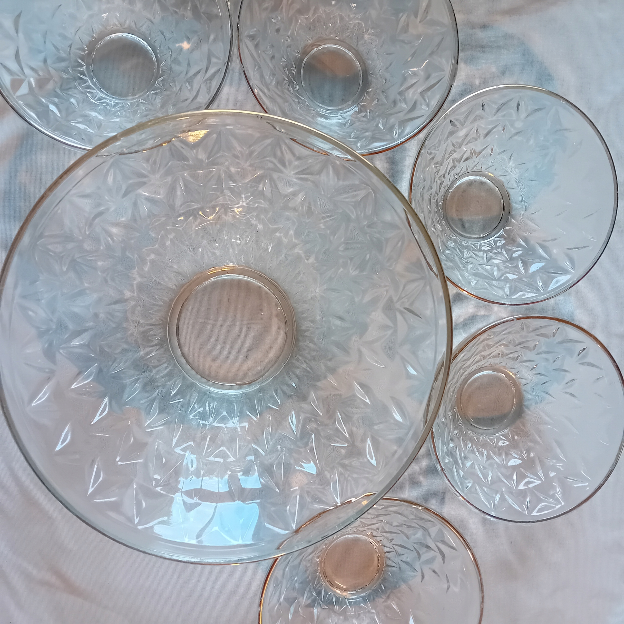 Продаю набор мисок 1+5 производства HSG Ząbkowice, узор «Треугольники», дизайн Богдана Купчика. Чаши из прозрачного прессованного стекла, позолоченные ободки, что редкость для этой модели. Высота большой чаши 8,5 см. Диаметр 23,2 см. Диаметр дна 8,4 см. Высота маленьких чашек 6,7 см. , диаметр 12,2 см. В хорошем состоянии. Небольшие эксплуатационные царапины, неглубокие и не очень заметные. Крошечные пузырьки воздуха в массе. Цена указана за весь комплект.