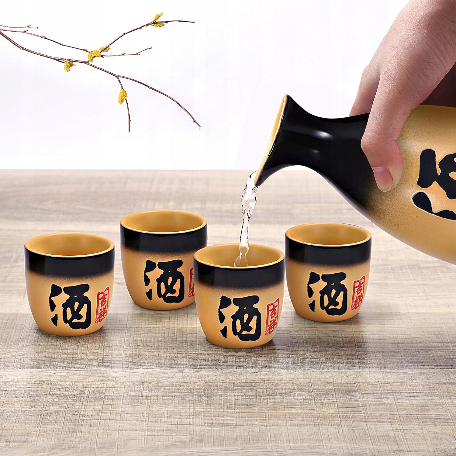 Набор состоит из 4 чашек (чоко) и кастрюли (токкури). Изготовлен из керамики с использованием традиционных технологий производства, можно мыть в посудомоечной машине и использовать в микроволновой печи.Кастрюля: 8 x 15 см, высота: 295 мл, внешний цвет: черный с матовой охрой/желтой/бежевой эмалью и надписью. Кружка: 4,8 х 5 см В, емкость: 50 мл, внешний цвет: черный с матовой охрой/желтой/бежевой эмалью и черными буквами.
