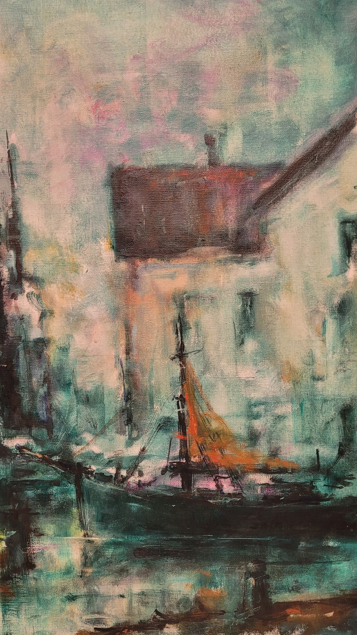 Объект продажи - это красивая старая нефтяная картина «городской пейзаж с портом».