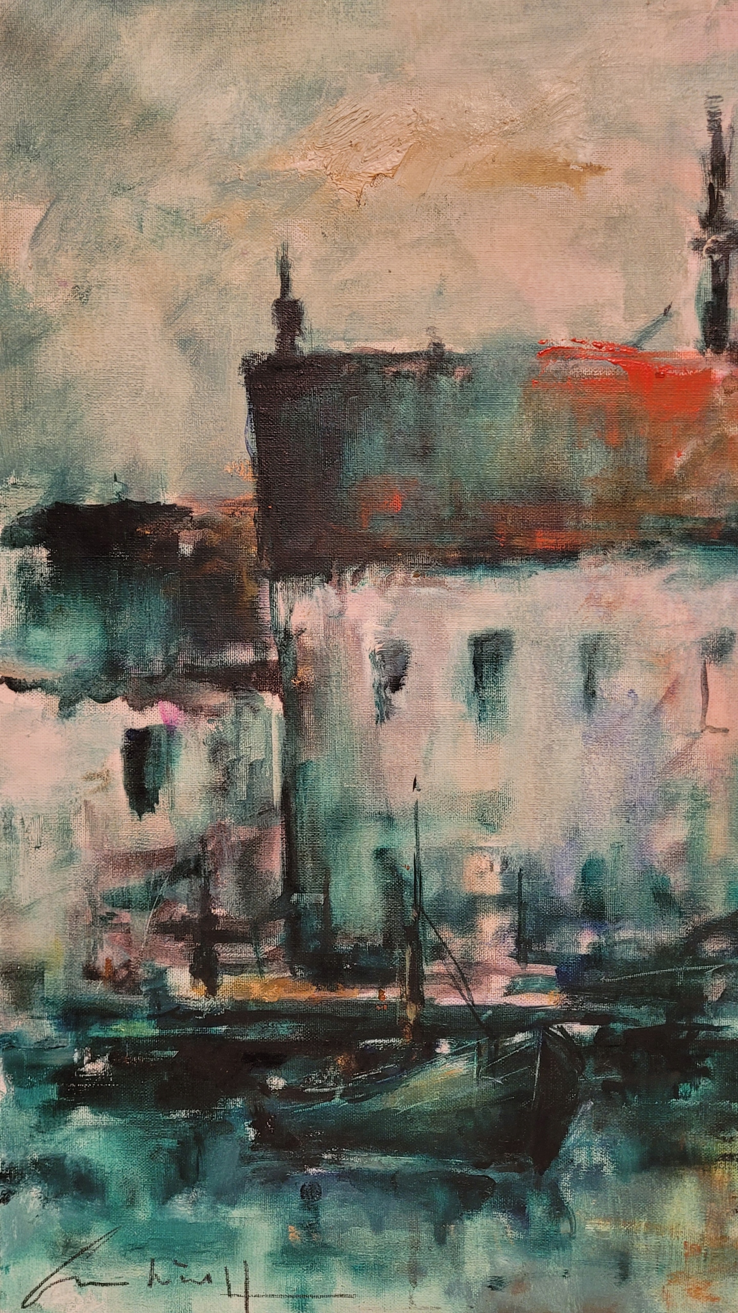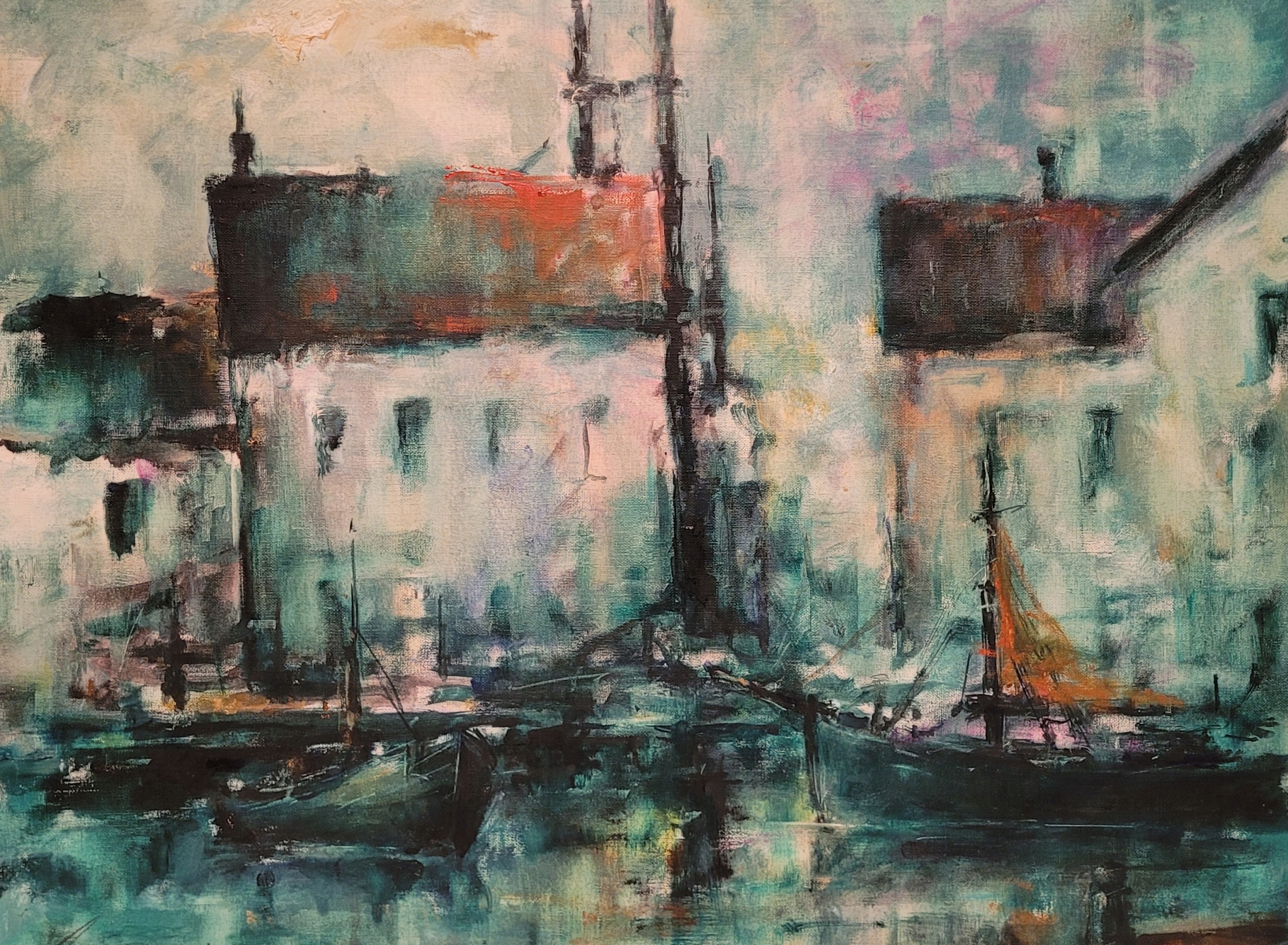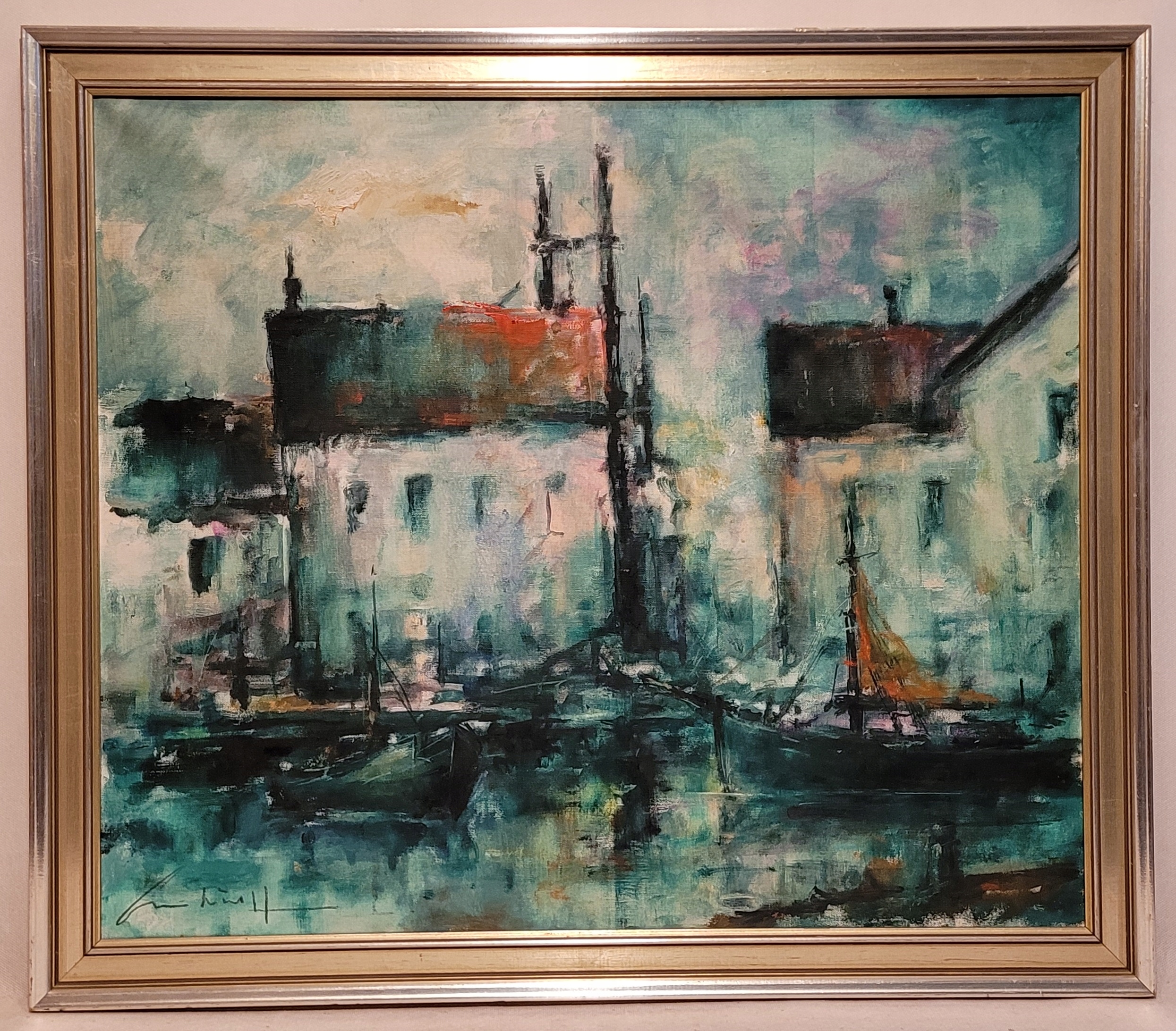 «Городской пейзаж с портом», красивая, подписанная нефтяная картина.