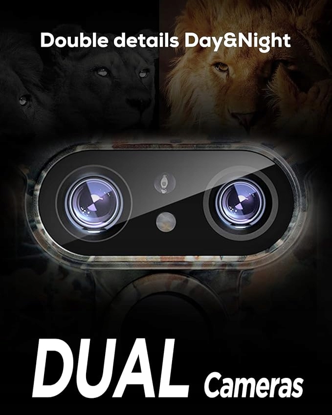 Инновационная конструкция с двойными линзами и идеальным ночным видением в свете звезд: оснащен двумя передовыми оптическими линзами, эта охотничья камера записывает четкие, красочные картины и фильмы при дневном свете и автоматически адаптируются к различным условиям освещения благодаря инфракрасным датчикам. Вы можете получить красочные картины на слабых и чрезвычайно чистых черно -белых изображениях в полной темноте.