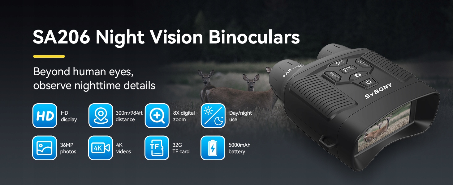 Охотничий бинокль Svbony SA206, 8-кратное ночное видение, 4K, аккумулятор 5000 мАч, с TF 32 ГБ