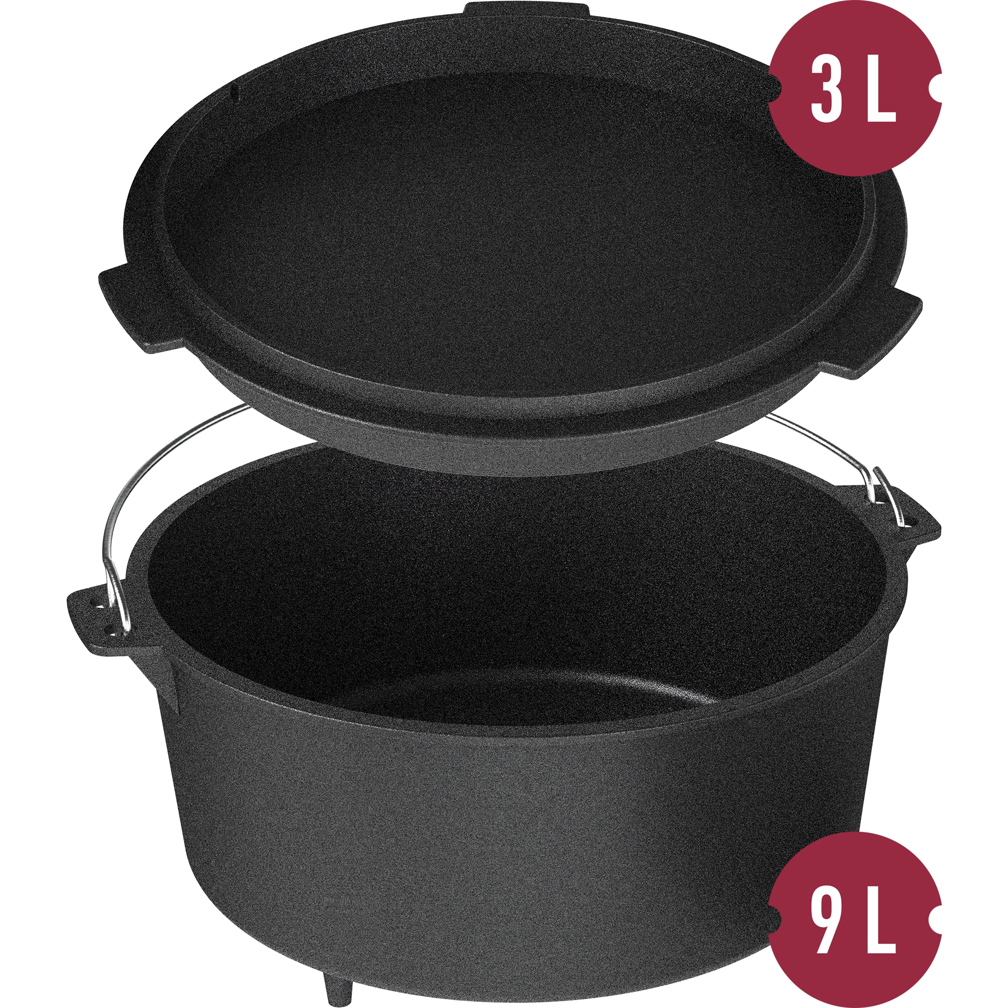 - Идеальное приготовление и жарение на огне – казан большой вместимости (9 л) с возможностью использования крышка (3 л) как сковорода.отличная альтернатива шашлыку с семьей или друзьями. Позволяет готовить вкусные и ароматные блюда в одной кастрюле, а также жарить на сковороде.