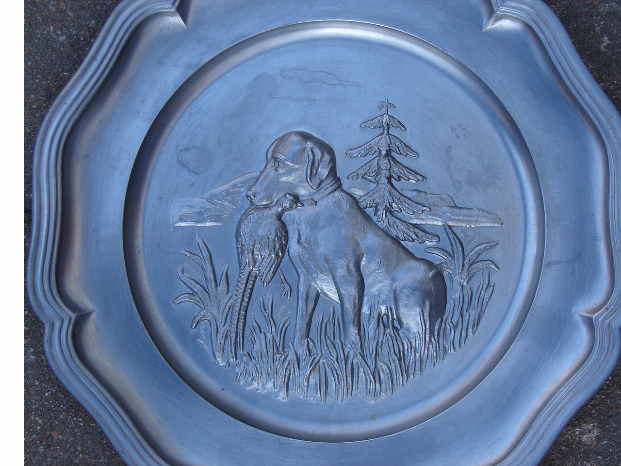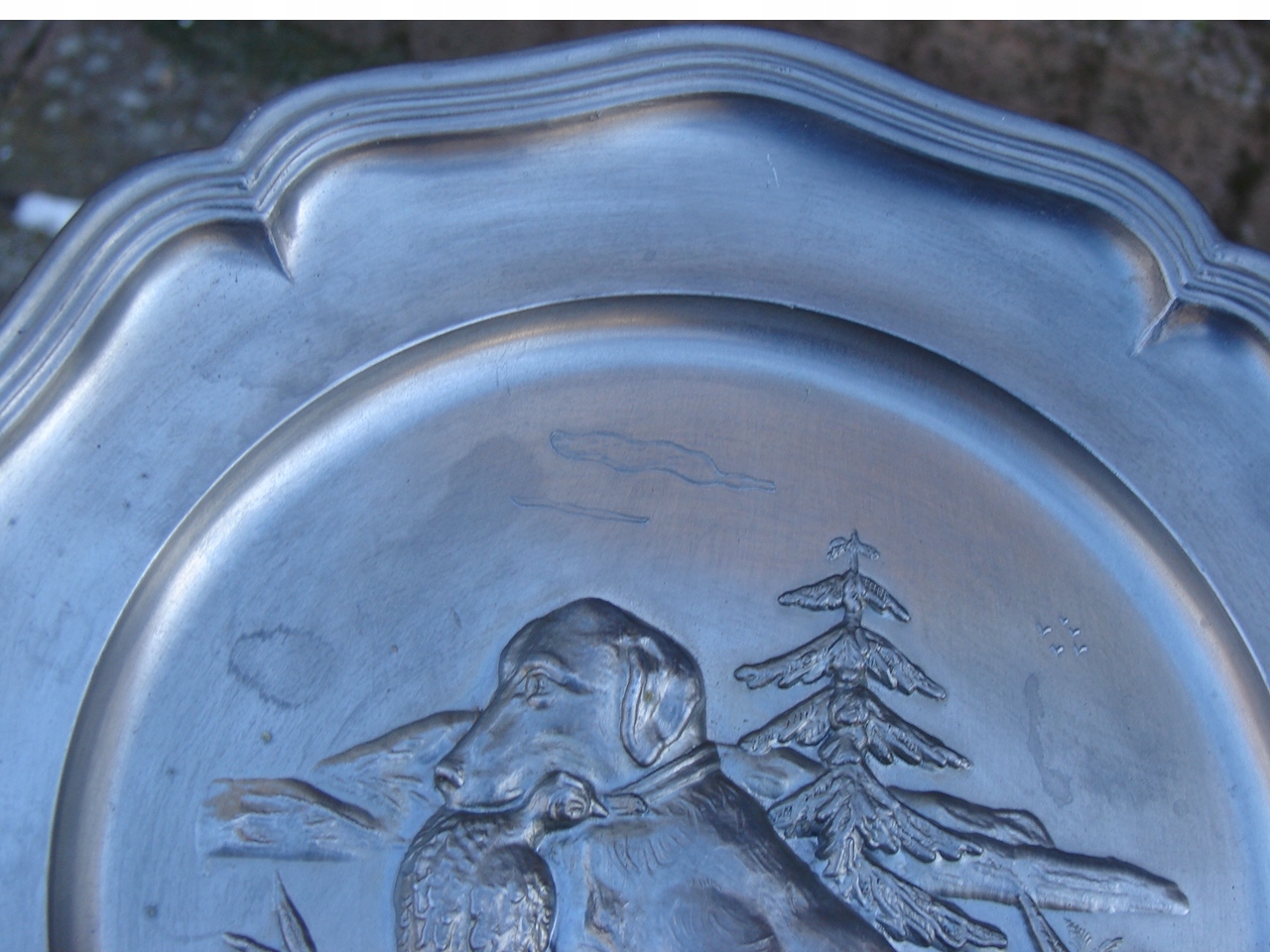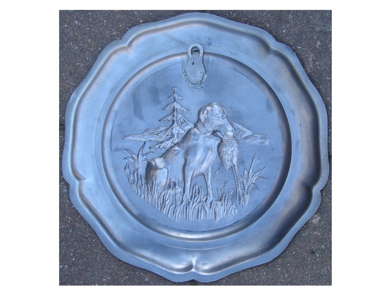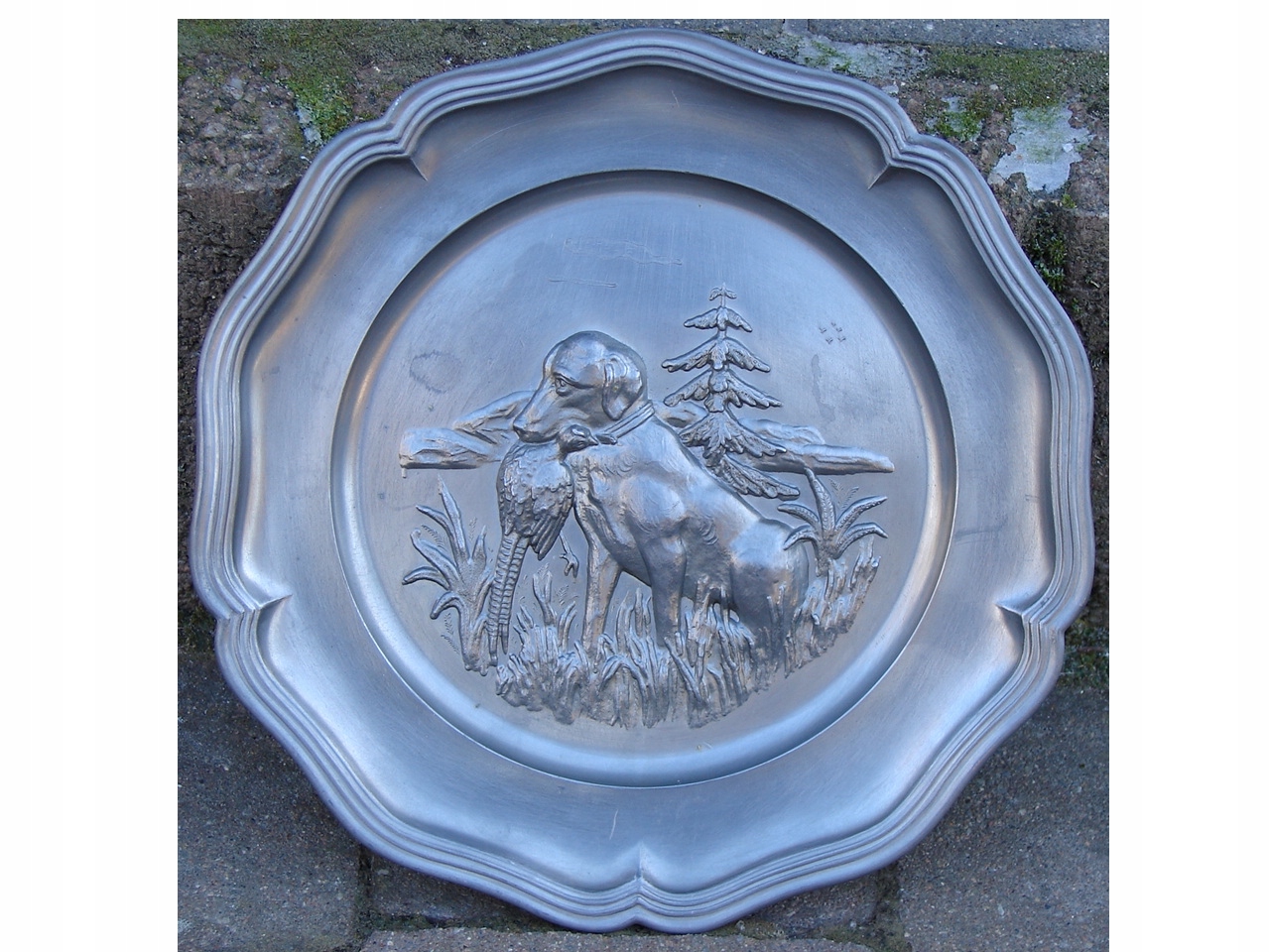 Жестяная настенная тарелка, выполненная в декоративной форме, украшенная сценой охоты в виде выпуклого рельефа.