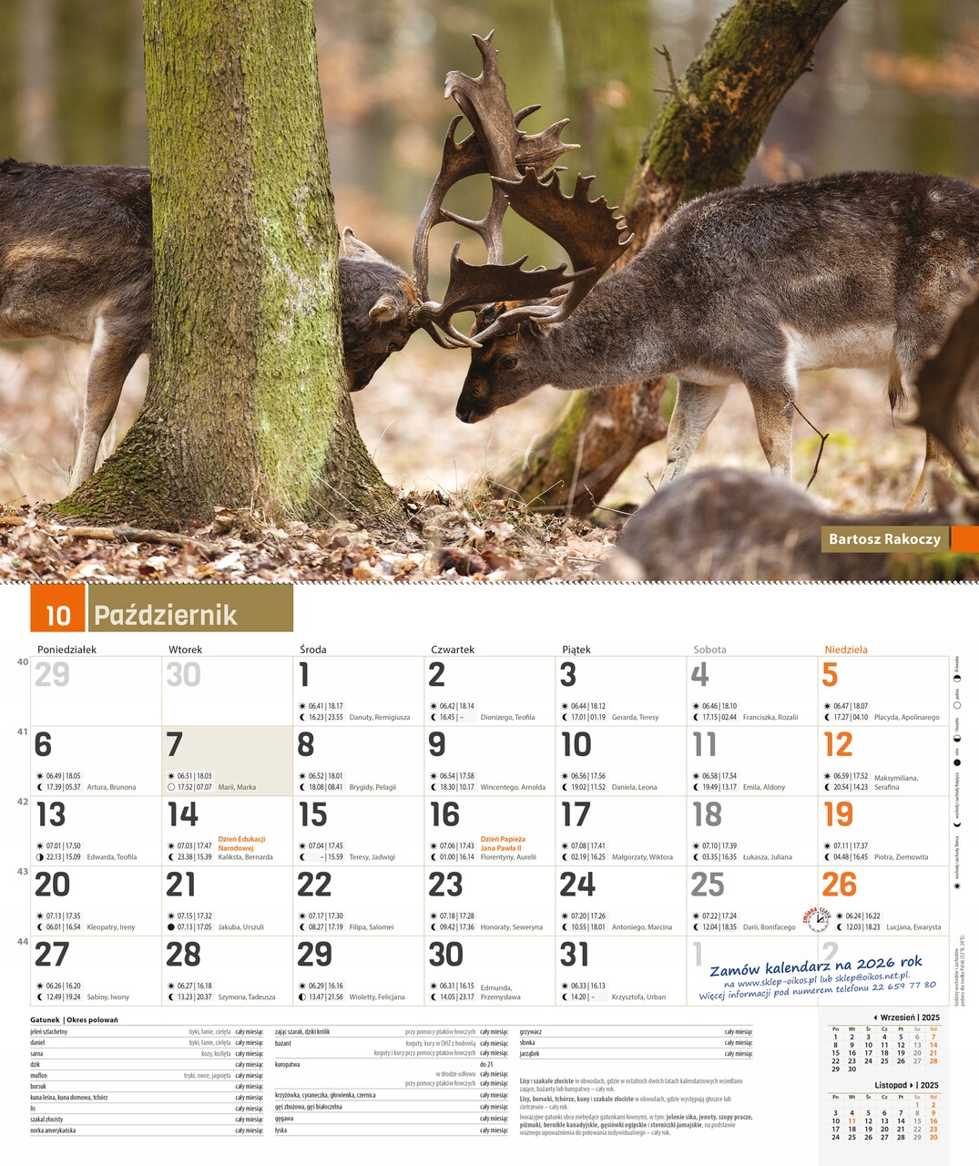 – отмечены события, важные для каждого охотника, лесника и любителя природы, например, День Святого Патрика. День Юстаса и Святого Юстаса Губерта, Всемирный день соколиной охоты, Международный день бобра или День польской незабудки,