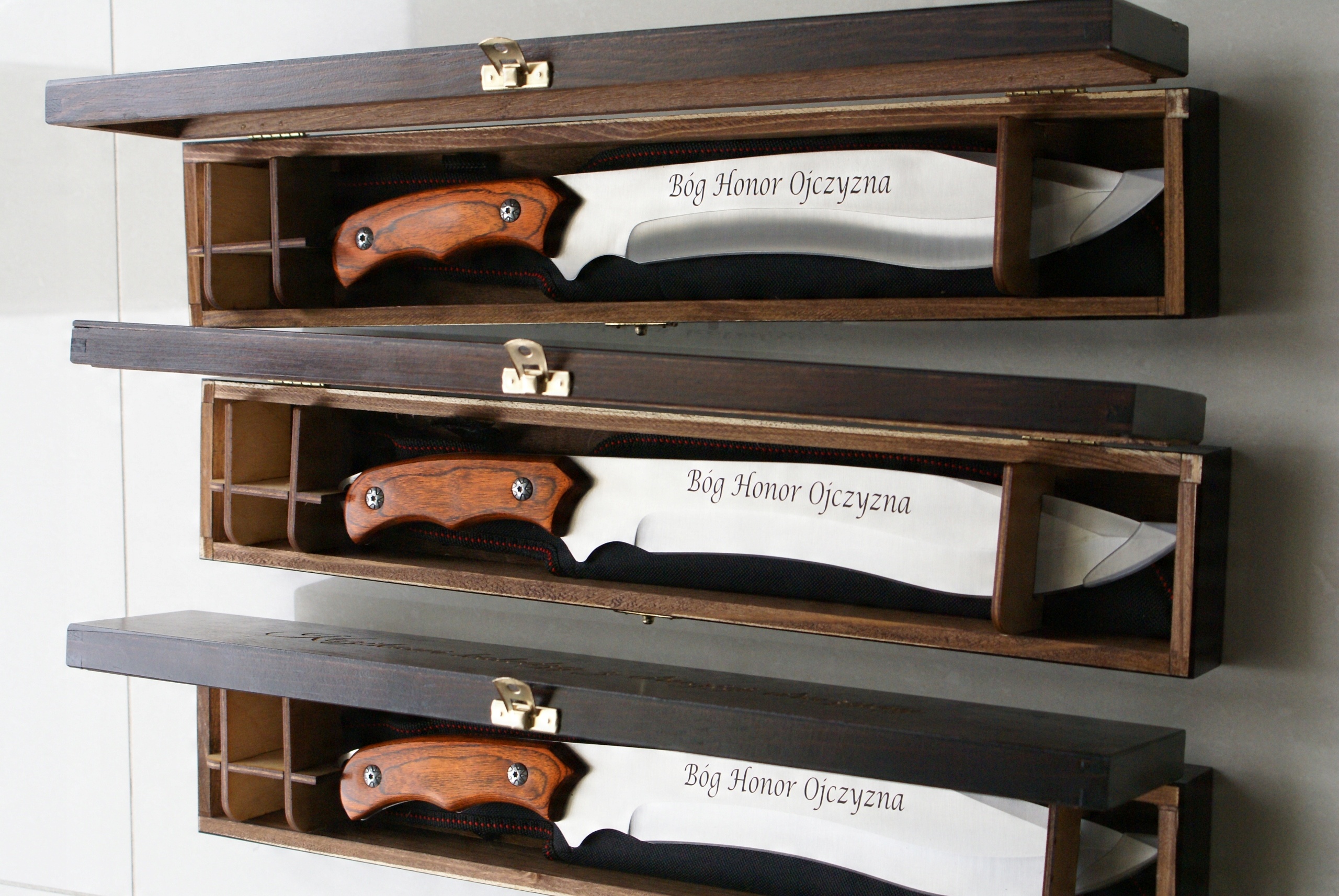 Нож охотничий с вашей гравировкой в элегантной лакированной деревянной коробке.