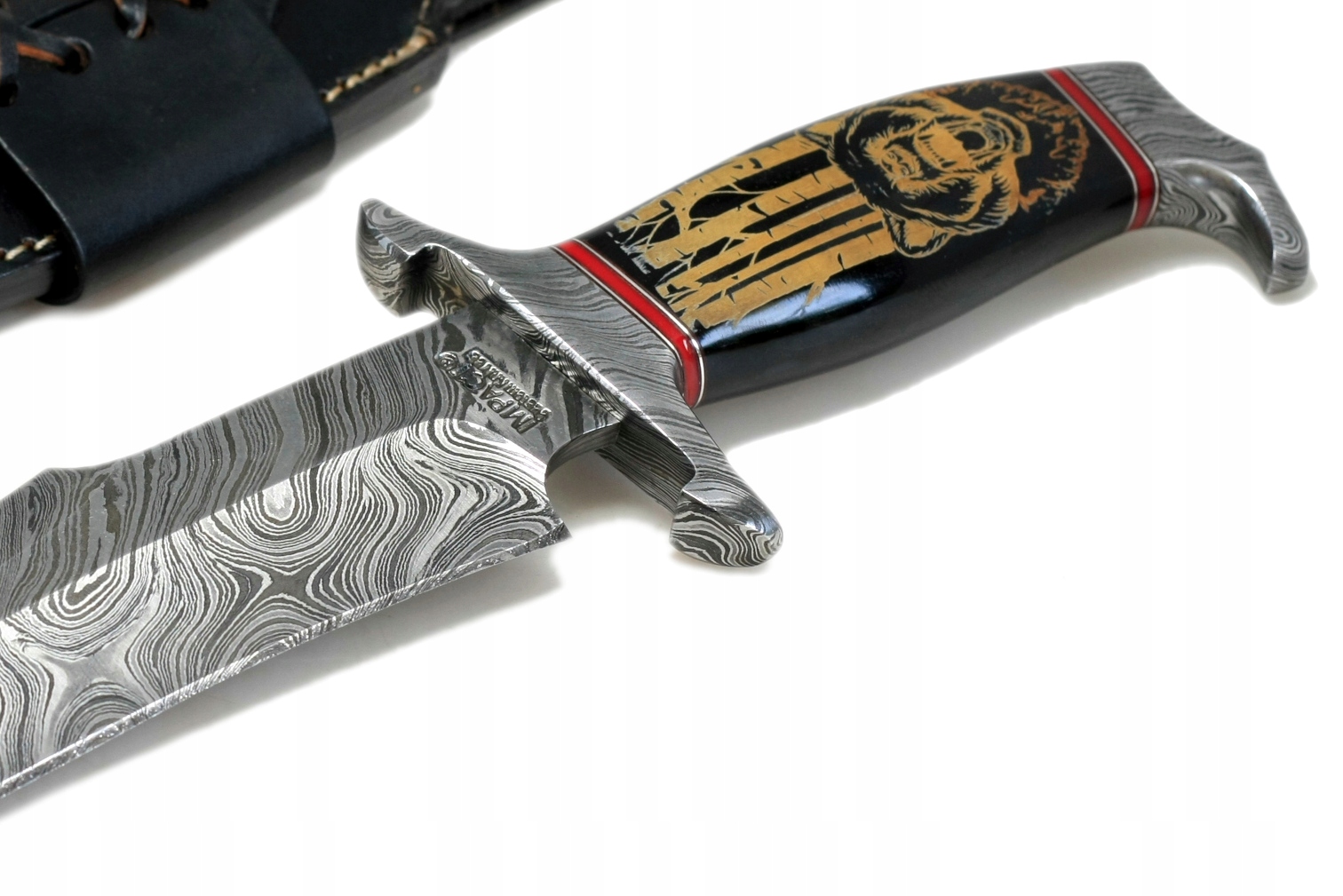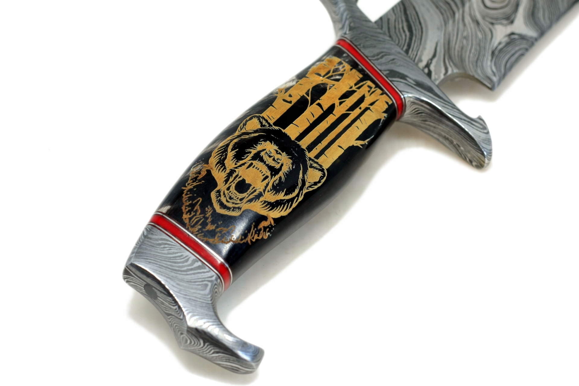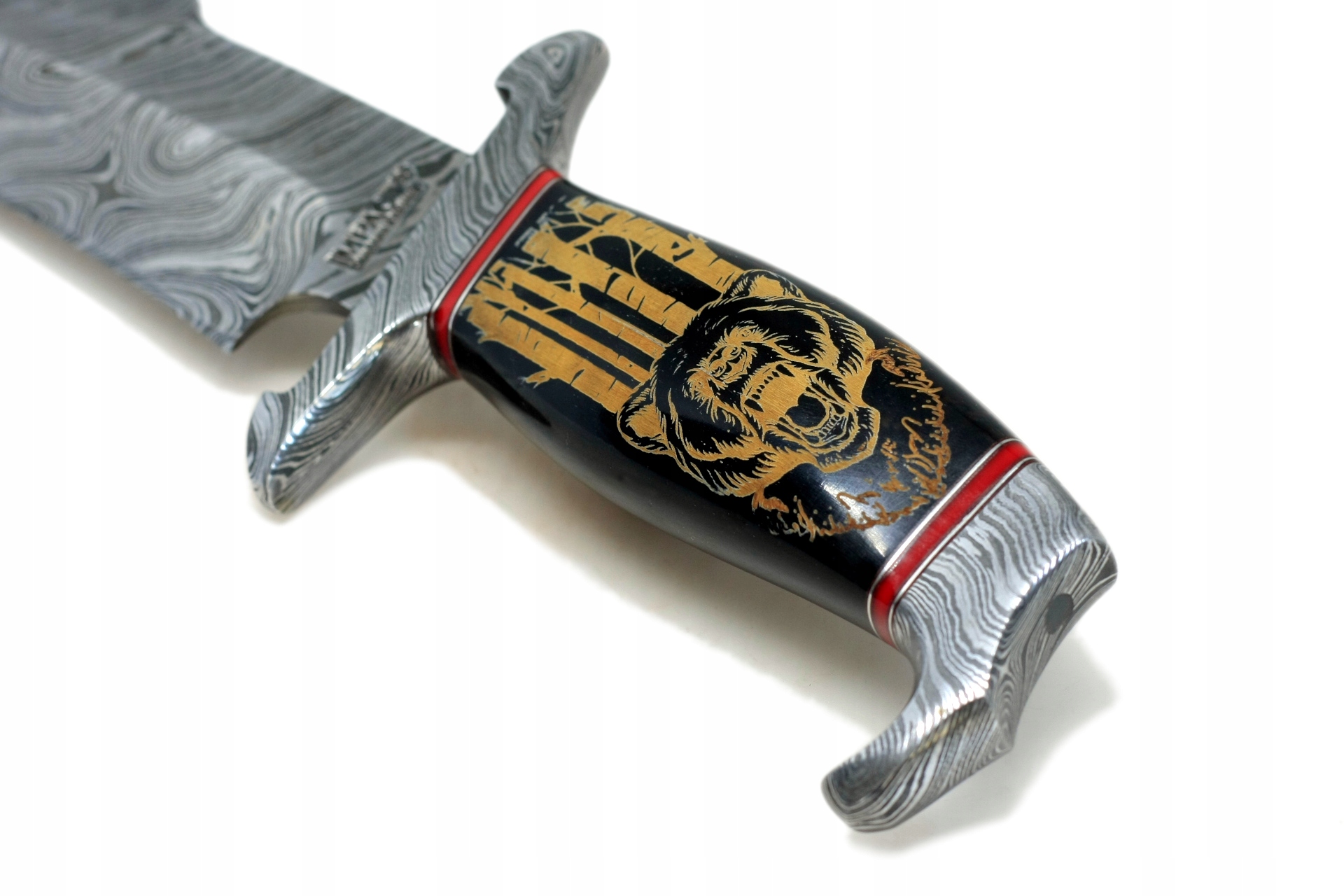 Клинок ножа является результатом многих часов ковки. Немногие производители могут получать такой шаблон на слои, текущие к краю лезвия - это создает эффект пилочного лезвия на микроскопическом уровне, что позволяет вам сохранять свойства резания лезвия в течение длительного времени без необходимости тота, в то время как другие лезвия тупо. В идеале подходит снаружи- охота, рыба, кемпинг.
