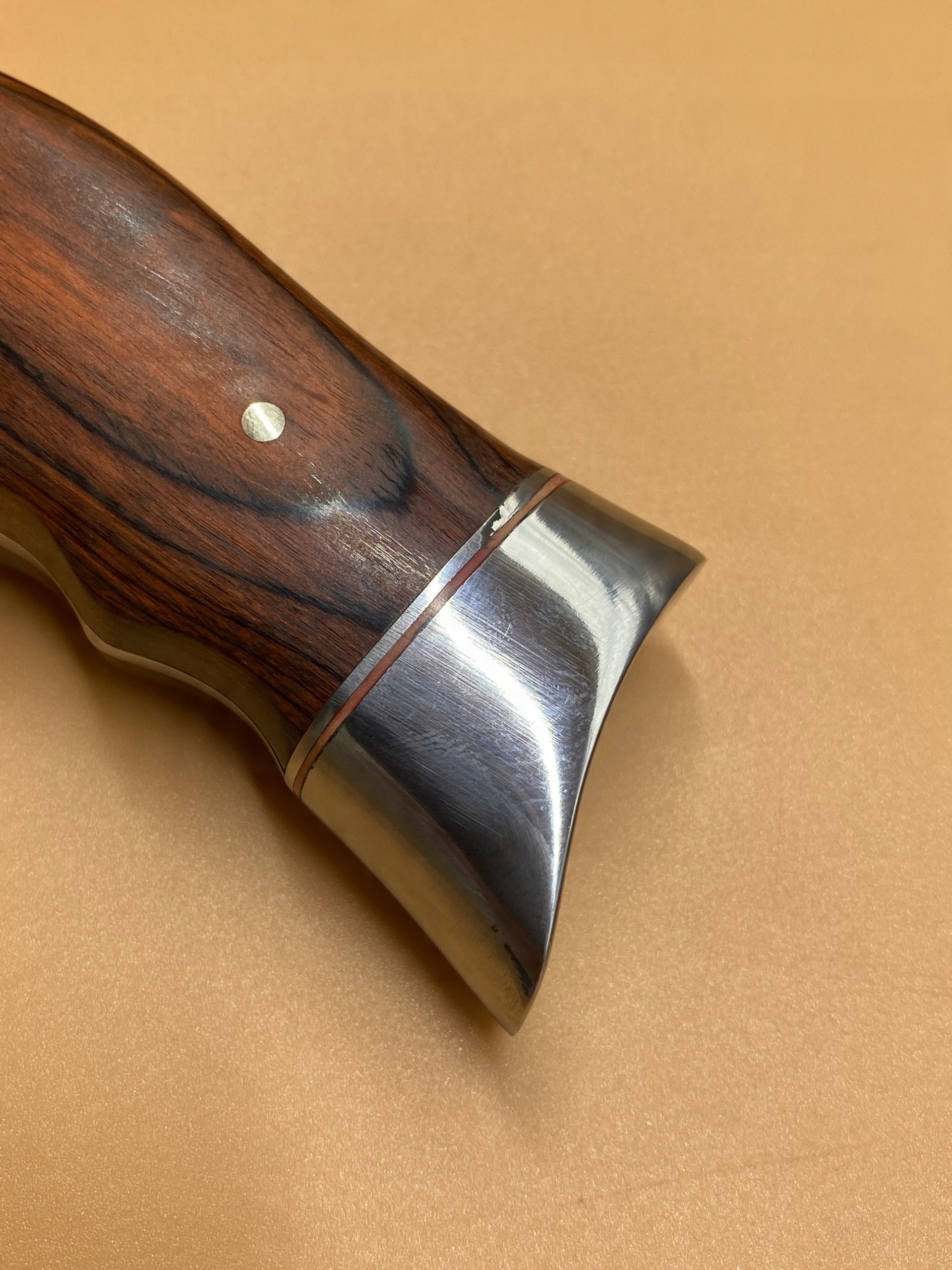 Деревянная рукоятка выполнена с поистине мастерским мастерством с точки зрения анатомии, что обеспечивает надежный хват и маневрирование ножа, кроме того, рукоять доработана с красными прокладками, которые можно увидеть на прикрепленных фотографиях.