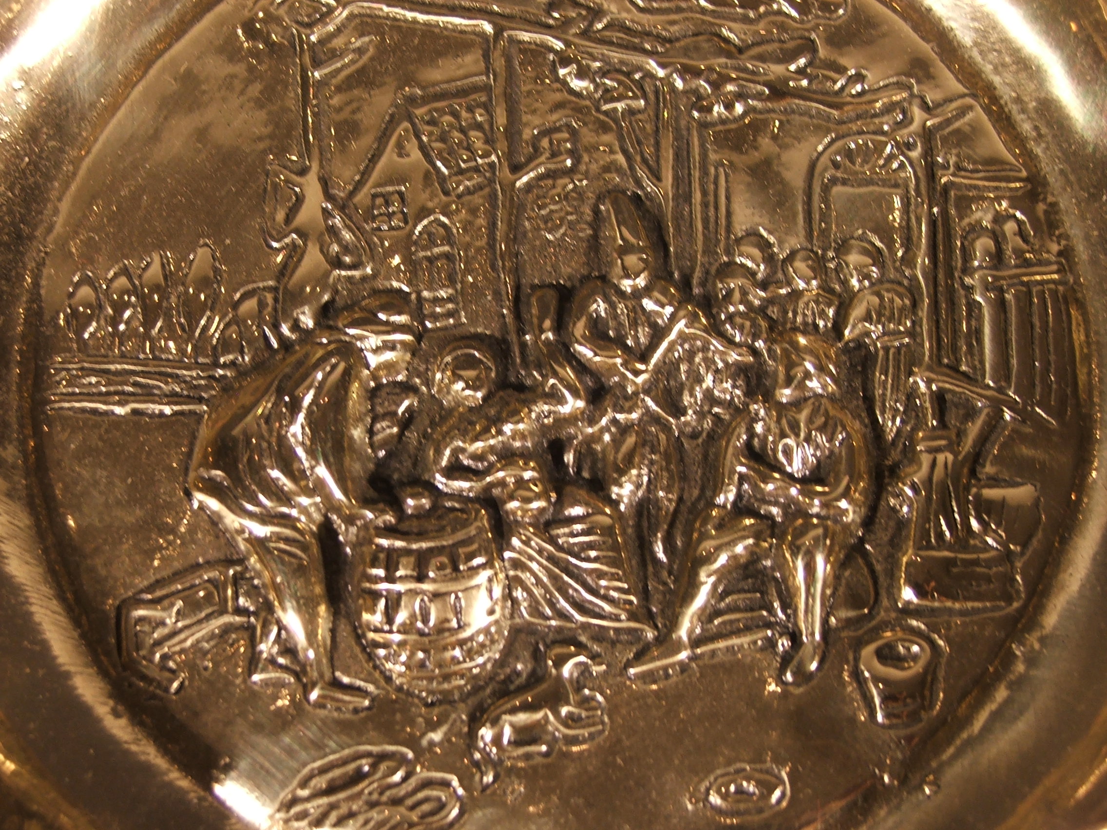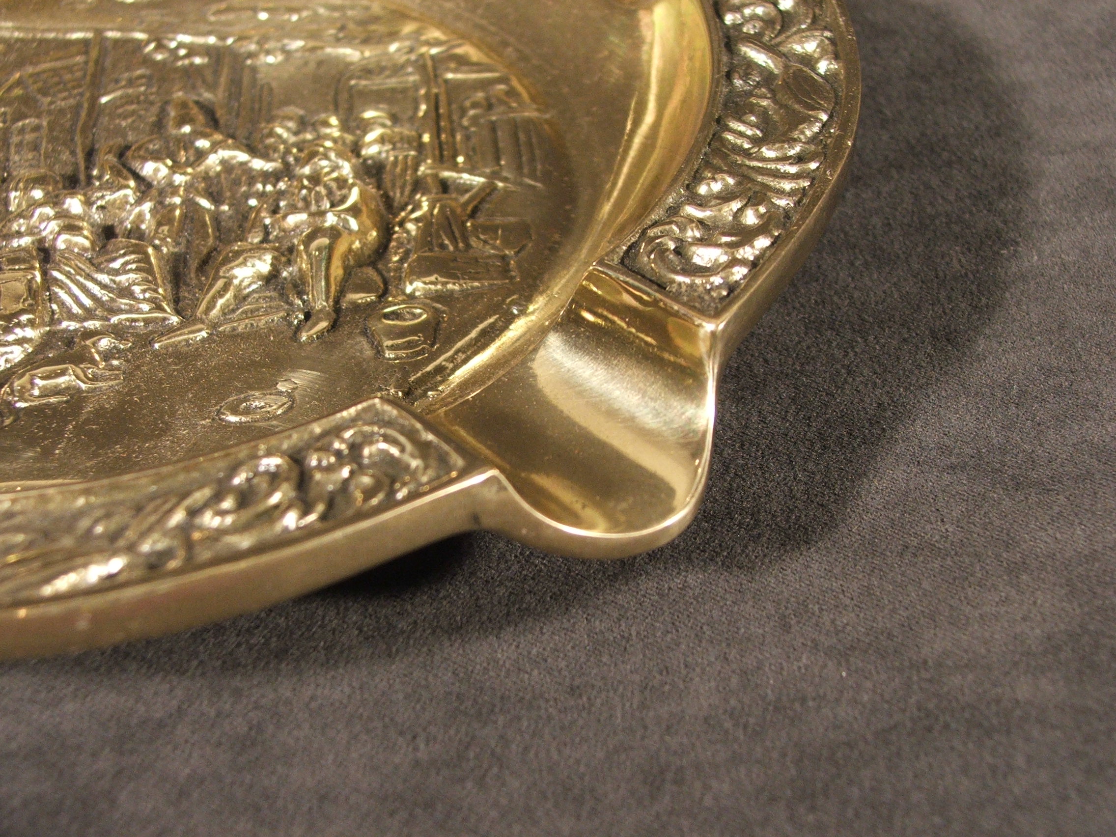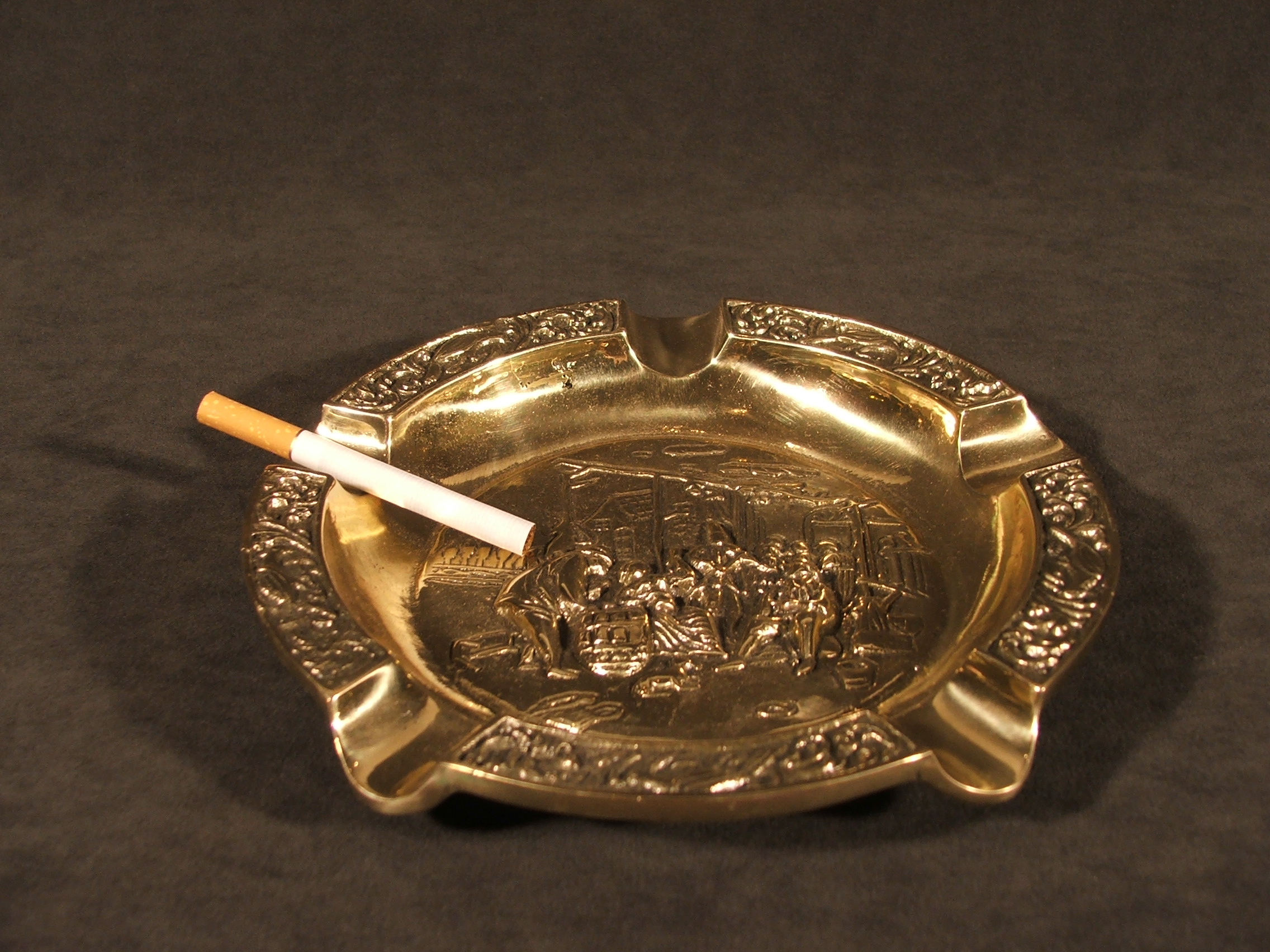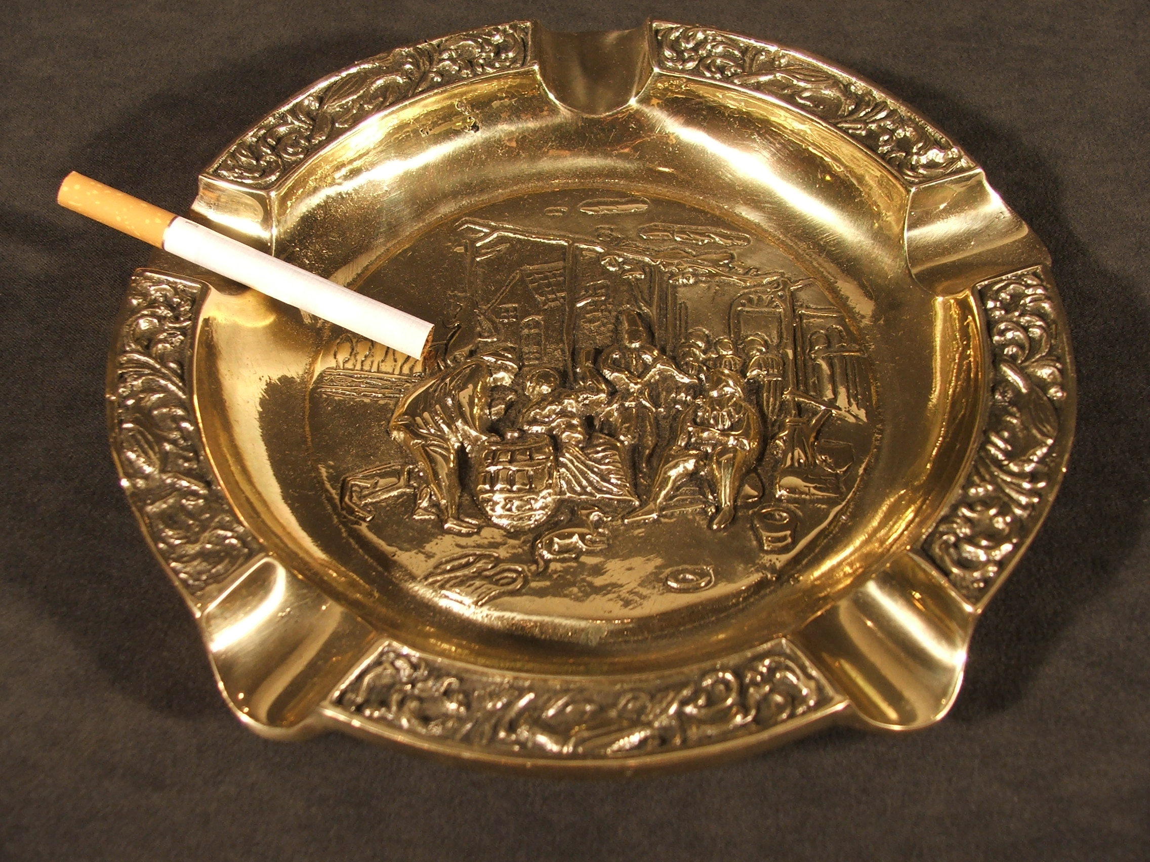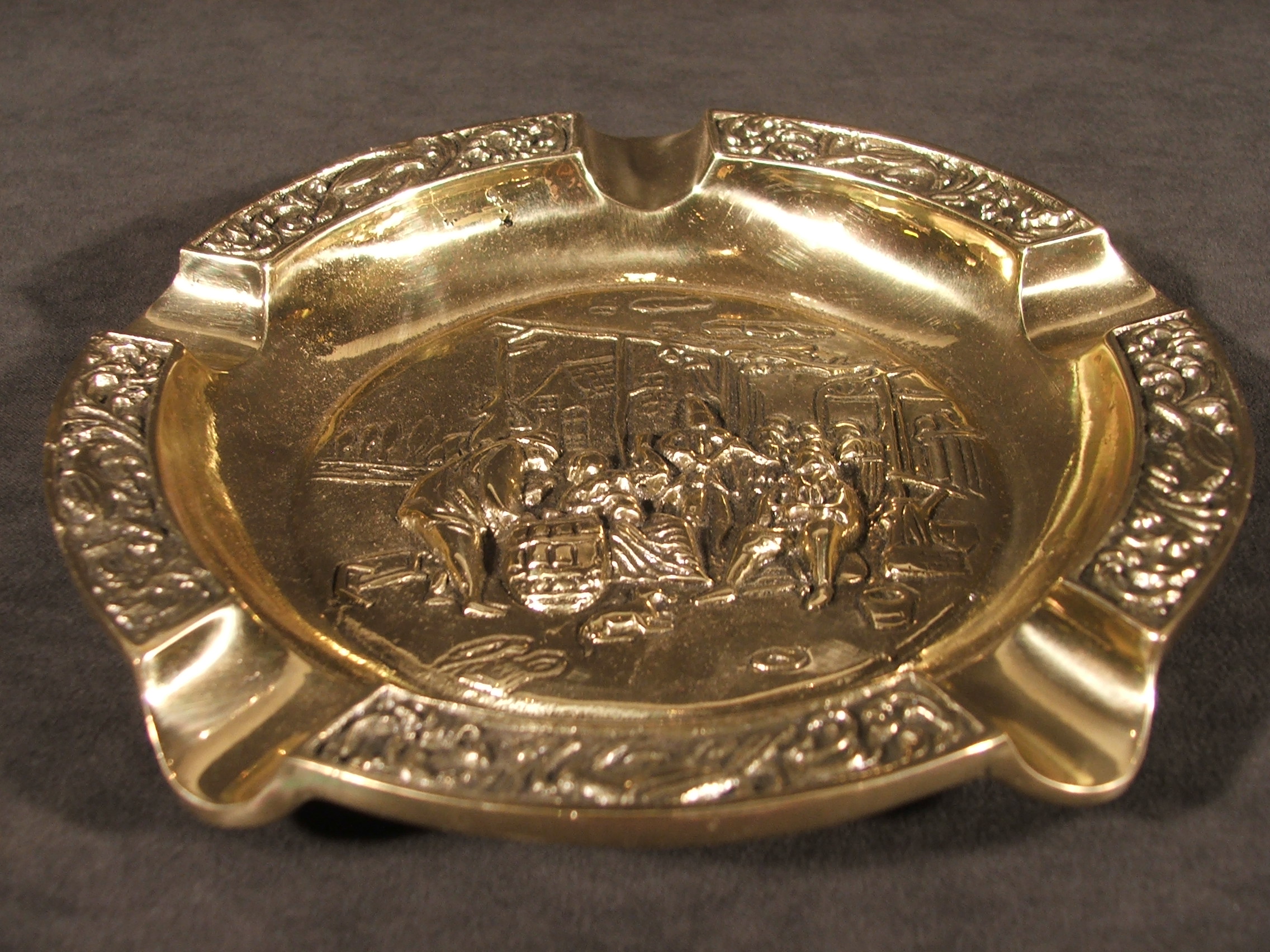 Пепельница была сделана из латунного кастинга польским мастером. Край пепельницы завершился замысловатым рисунком с пятью разрывами на задней части тлеющей сигареты. Середина пепельницы представляет сцену из жизни крестьян, просто играющих в карты. Продукт хранится в древнем характере, отполирован в обнаженных местах, темнее в уголках. Прекрасно выполняет свою роль, кстати, украшая интерьер.