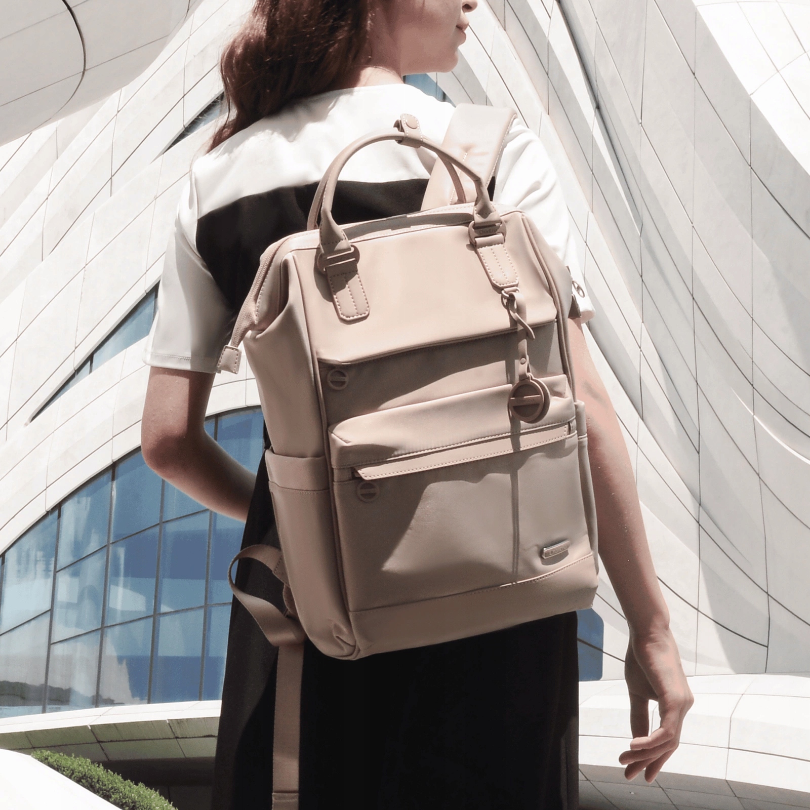 Рюкзак бежевого цвета оснащен двумя прочными верхними ручками, которые легко соединить специальным ремнем. Благодаря этому у вас есть выбор и вы сами решаете, как его носить.
