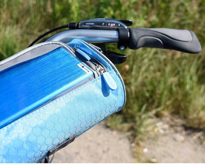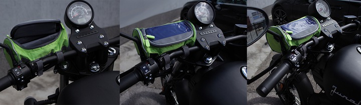Сумка закрывается на молнию на две молнии. В верхней части сумки предусмотрено место для телефона или навигации с прозрачным окошком из ПВХ. Прозрачное окно позволяет управлять телефоном с помощью сенсорного экрана. Отделение для телефона покрыто полиэтиленовой губкой и закреплено прочной застежкой-липучкой, предотвращающей случайное выскальзывание телефона. В нижней части есть место для документов, ключей или других предметов.