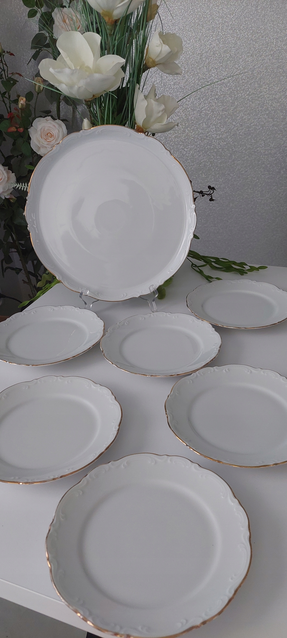 Тарелка с шестью тарелками MITTERTEICH. Блюдо диаметром 30 см, десертные тарелки диаметром 19 см. У пластин отсутствует позолота по краю.