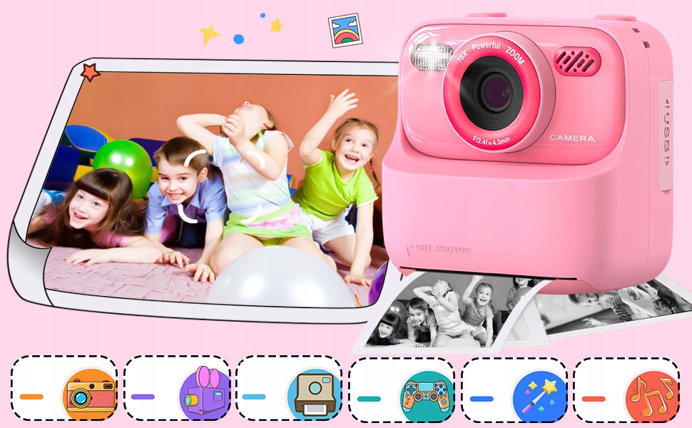 - Эта цифровая камера предлагает немедленную печать, вспышку, большой экран с диагоналем 2,4 дюйма, тремя образовательными играми, 20 очаровательных кадров и пять фильтров, две камеры селфи (спереди и сзади), видеозапись в режиме реального времени, записи ногов, музыкальный проигрыватель MP3 и многие другие функции.
