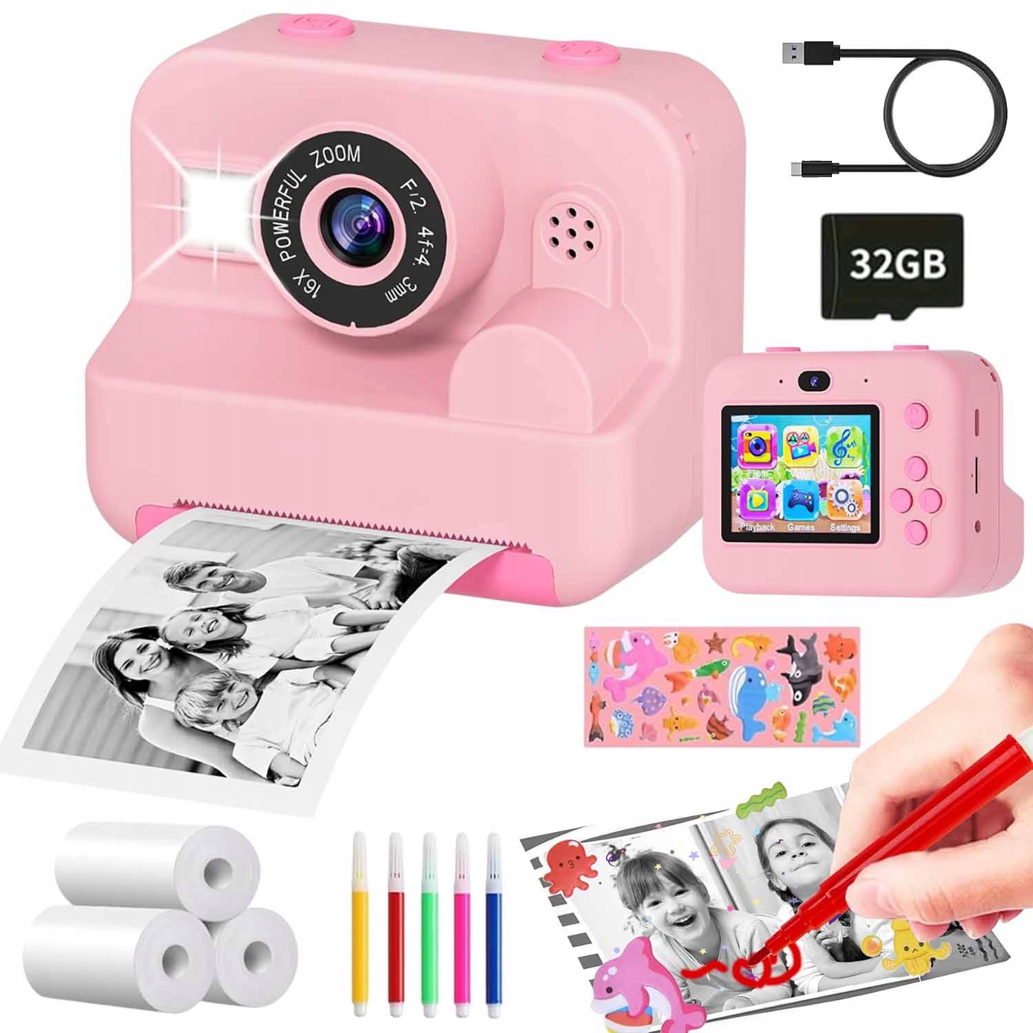 Мгновенная камера розовая печать 16x Zoom для детей + 3 ролика