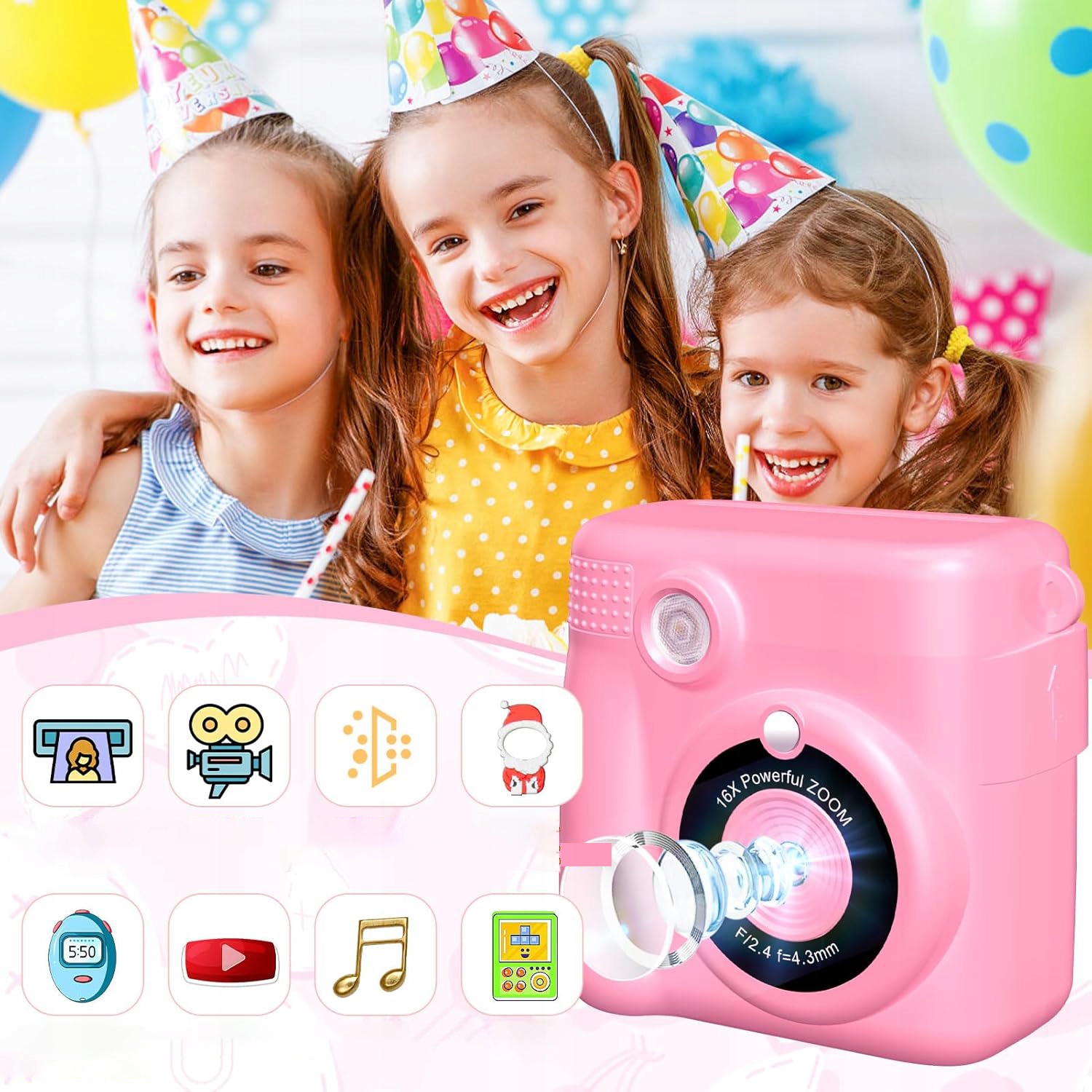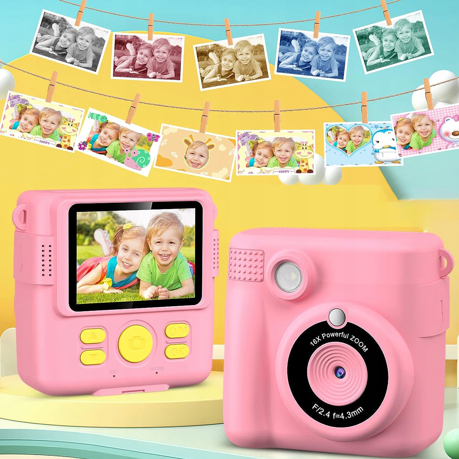 【Многофункциональная цифровая камера для детей】Эта детская камера с моментальной печатью, большим экраном 2,4 дюйма, видео 1080p, 16-кратным цифровым зумом , вспышка, покадровая съемка, серийная съемка, игры, фильтр-рамка, mp3. Это хороший выбор. сопровождать детей, чтобы они росли счастливо. Подарите прекрасный момент вам и вашей семье.