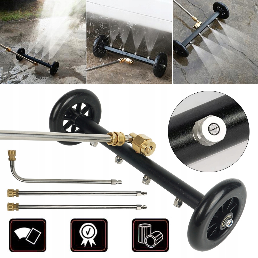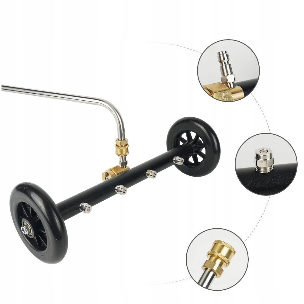 4. Сборка и использование. Просто установите переоборудование на шайбу с высоким давлением и можно использовать. Шасси】: 15-дюймовая очищающая шайба, подходящая для горячей и холодной воды. Конструкция прочная, с 2 гибкими резиновыми колесами, обеспечивающими легкое движение, а также оснащены 4 соплами, которые увеличивают чистящую поверхность. Включает 3 удлинителя давления, 1 склонность под углом стержня 90 градусов, 2 прямых стержня 15,87 дюйма, 1500-4000 собак: оба стержня оснащены быстрыми соединениями с резьбой 1/4 дюйма для легкого соединения и отключения. Максимальное рабочее давление составляет 4000 фунтов на квадратный дюйм.