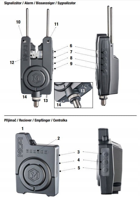 Знаки укуса MCA, разработанные и разработанные брендом Mivardi в Чешской Республике. Значения- Серьезное качество и надежность. Они предлагают 8 уровней объема, включая тихой режим, 8 уровней чувствительности, 8 тонов с чрезвычайно широким диапазоном и 6 цветов. . В дополнение к сигнализации звука, света и вибрации, приемник также предоставляет предупреждение с низким зарядом аккумулятора, фонариком, заслуживающим рук и вспышкой палатки, активированным сигналом прикуса. Батареи не включены в набор