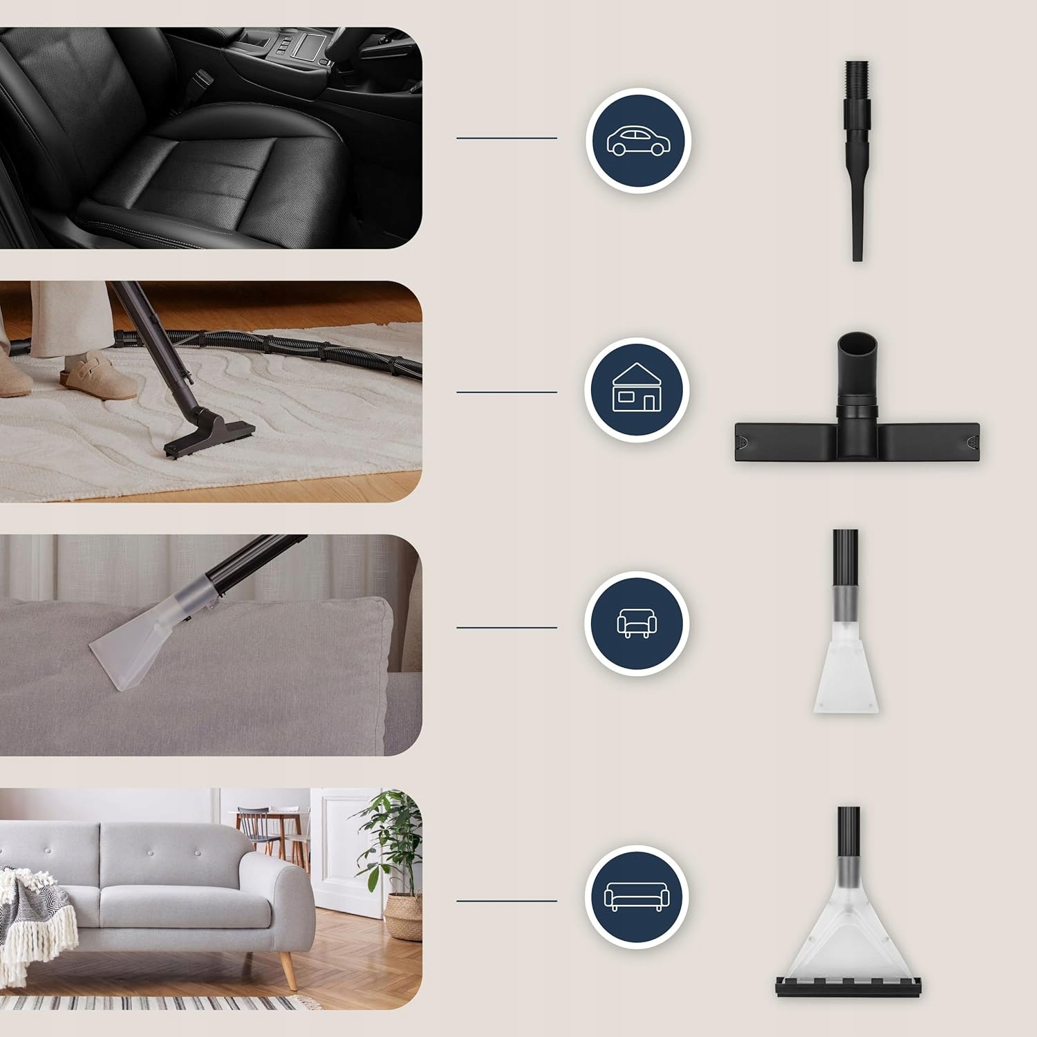 Усовершенствованная система вытяжки позволяет тщательно удалить пятна и грязь без риска намокания поверхности. Двигатель мощностью 1400 Вт с регулировкой мощности регулирует мощность всасывания в зависимости от типа поверхности, гарантируя оптимальные результаты при чистке ковров, обивки и ковриков 🛋️💪