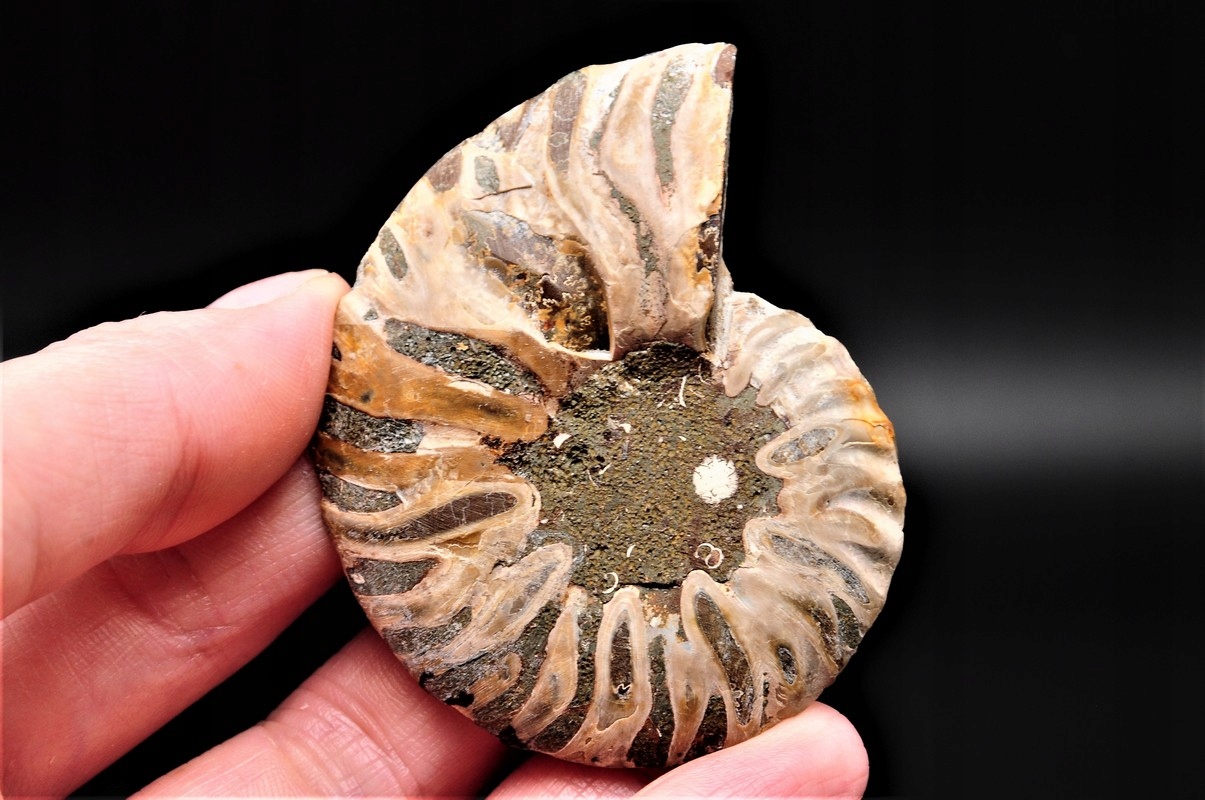Аммониты (Ammonoidea) — подкласс вымерших головоногих моллюсков (Cephalopoda), обычно с симметричной плоскоспиральной раковиной. Некоторые типы имели необычную форму, например, прямую оболочку, вертикально закрученную спираль или спираль с бесконтактными витками. Они встречаются в породах морского происхождения, датируемых от девона до конца мела. Некоторые отдельные камеры открыты и заполнены богатым набором бежево-серых и коричневых кристаллов кальцита, с перегородками между каждой камерой.