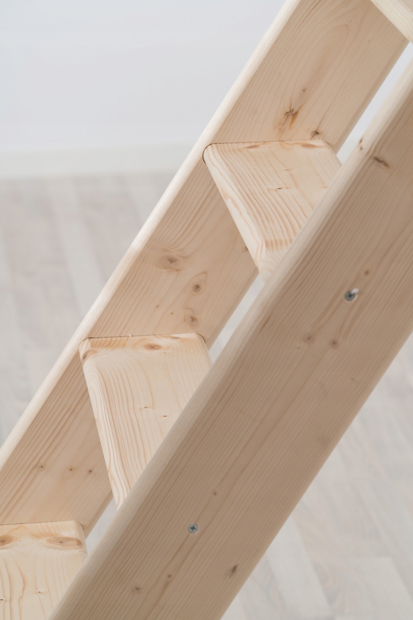 Ступеньки, косоуры и перила изготовлены из необработанной твердой древесины ели, сертифицированной FSC.