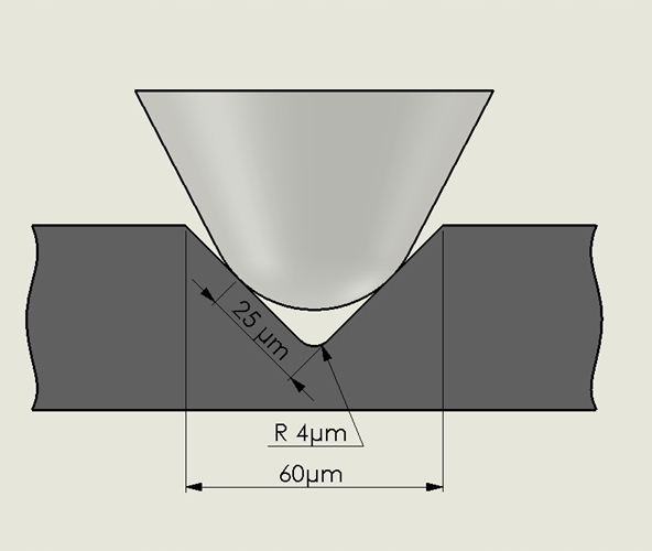 Геометрию моно-микроканавки довольно просто понять, поскольку она просто содержит один сигнал. Этот сигнал обрезается только сбоку от канавки, а это означает, что V-образная канавка будет иметь постоянную ширину и глубину. Угол V-образной канавки будет немного отличаться от диска к диску, но всегда будет близок к 90 градусам. Ширина верхней канавки, согласно различным стандартам, будет достаточно маленькой, чтобы обеспечить правильную посадку иглы в канавке. С годами эта минимальная ширина менялась в зависимости от меняющихся стандартов, но до середины 1960-х годов она всегда была близка к 50 мкм. Последние стандарты 1980-х годов были пересмотрены таким образом, что минимальная ширина может быть ограничена примерно 30 мкм. Это создало единый стандарт минимальной ширины канавки пластинки.