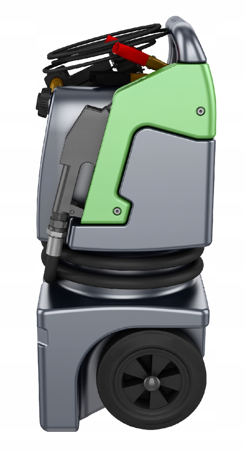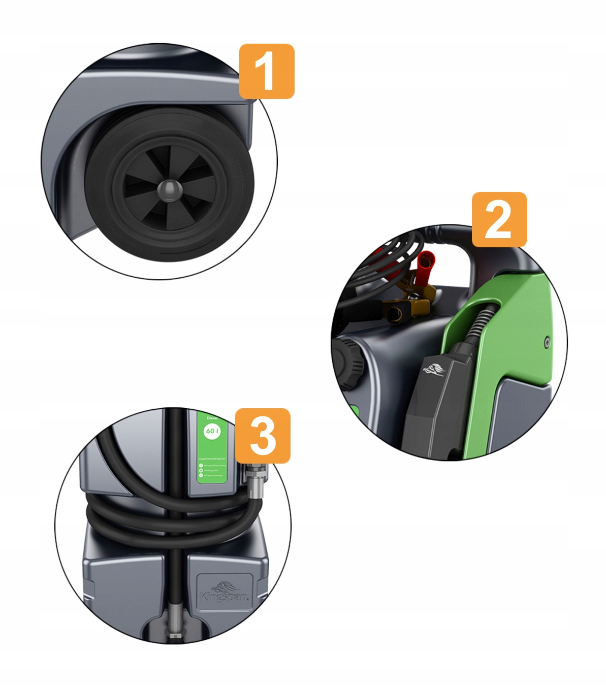 Колеса из твердой резины диаметром 25 см легко преодолевают грунтовую и неровную местность. Шаровой клапан предотвращает утечку вещества, а автоматический карман для пистолета собирает конденсат во время транспортировки. Практичный шланг длиной 3 м для раздачи дизельного топлива.