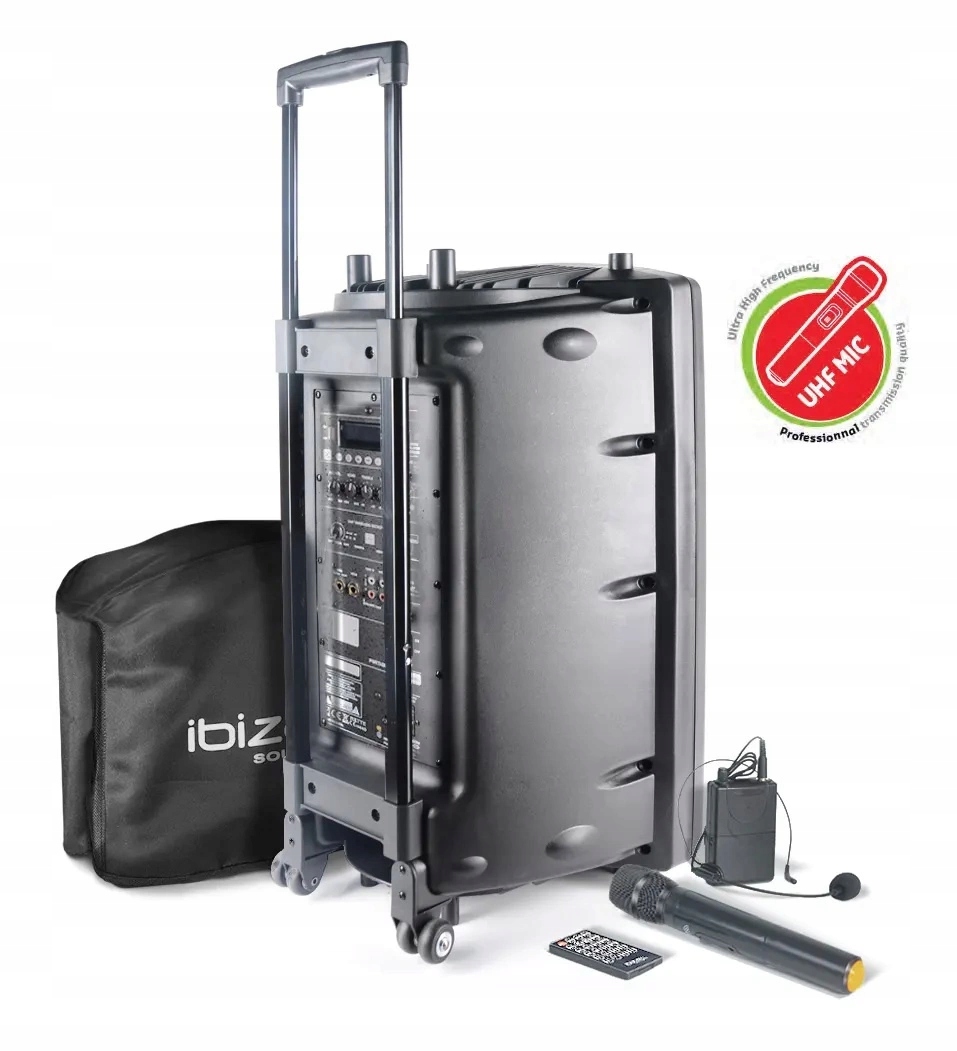 Ibiza PORT15UHF-BT — полностью мобильная и универсальная звуковая система, предназначенная для профессионального и любительского применения. Оснащенный перезаряжаемой батареей, телескопической ручкой и транспортировочными колесами, он обеспечивает комфорт и полную независимость от электросети. Идеально подходит для школ, детских садов, отелей, фитнес-клубов, а также для музыкантов, ведущих и аниматоров.