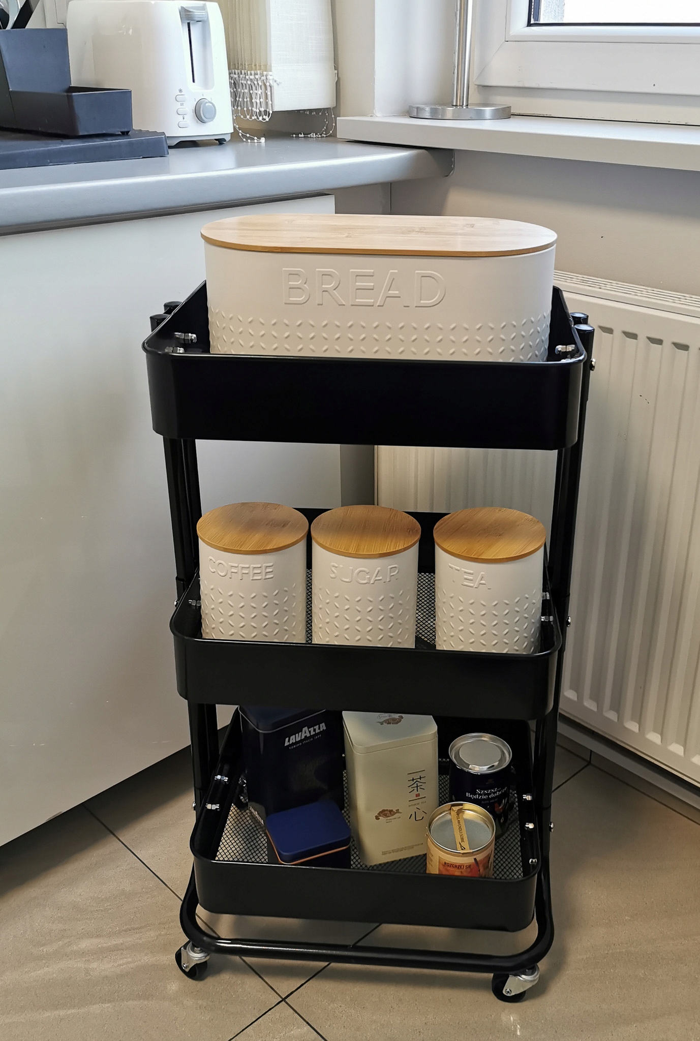МОБІЛЬНА ПОЛИЦЯ 3 ПОЛИЦІ КУХОННИЙ СТІЛ НА КОЛЕСАХ ЧОРНИЙ ВОЗИК