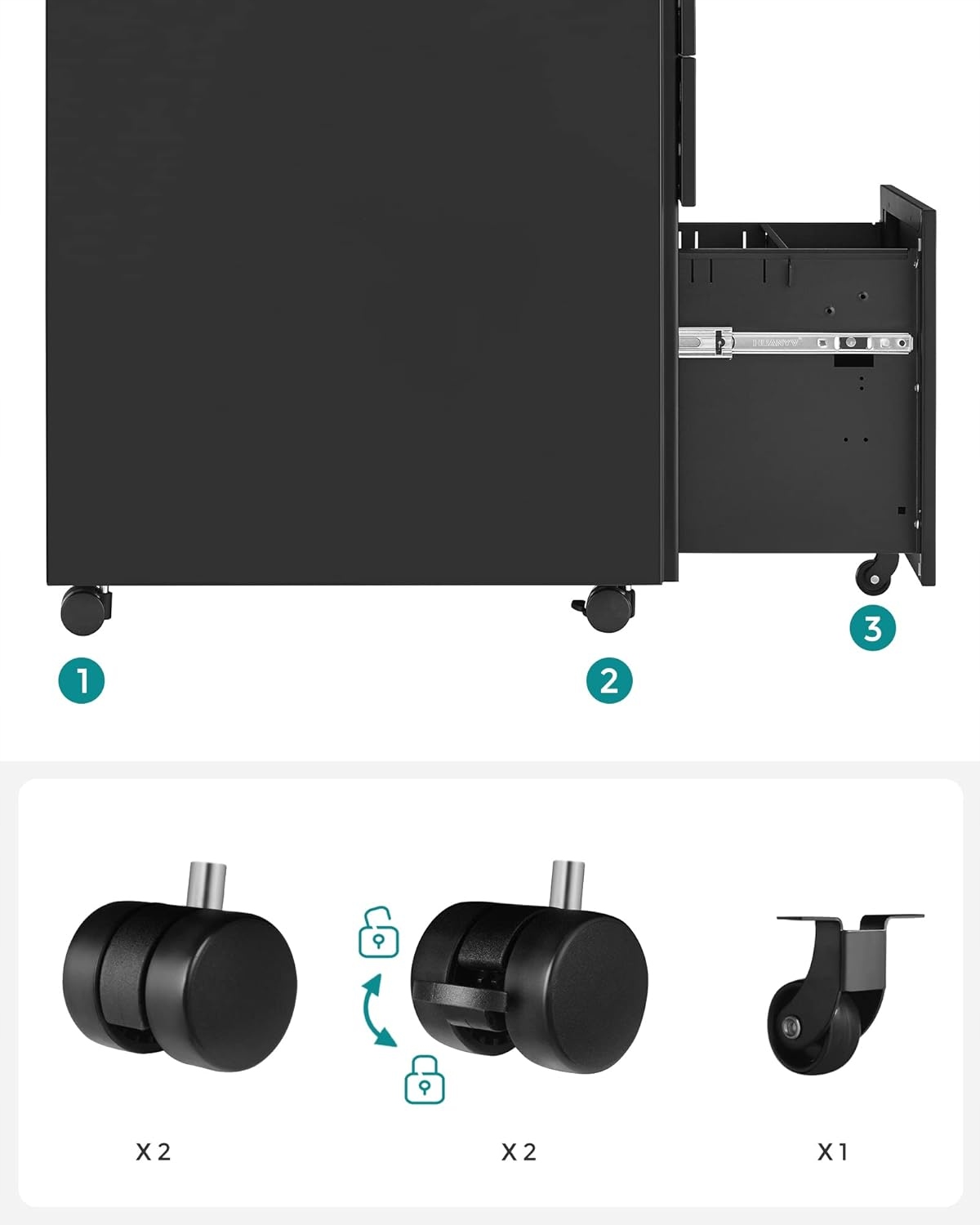 Мобильность шкафа обеспечивается четырьмя вращающимися колесами, два из которых имеют тормоза (пятый круг облегчает вытягивание нижнего ящика). каждая комната дома.