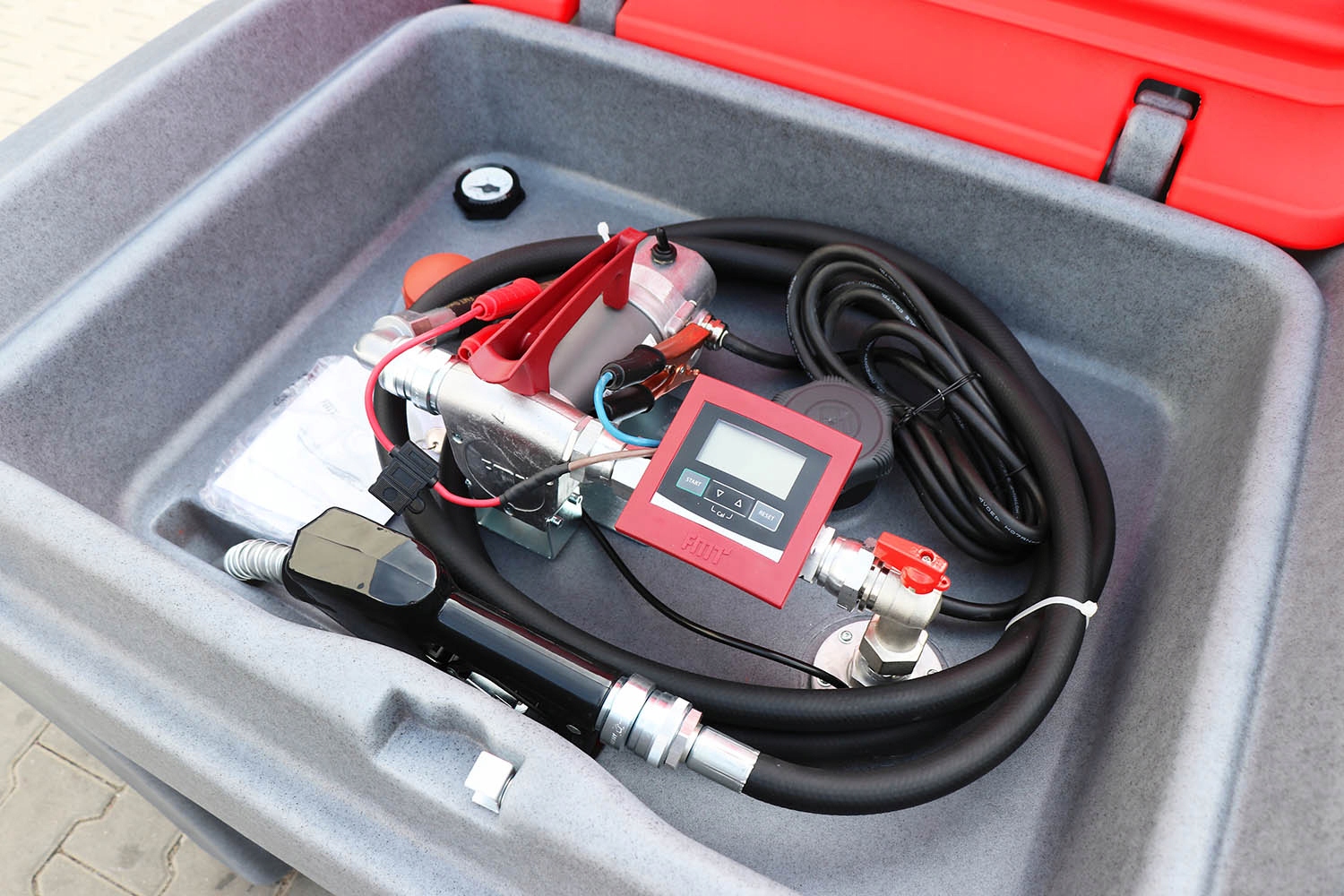 Топливо подается из бака через интегрированную систему с насосом, шлангом и пистолетом.