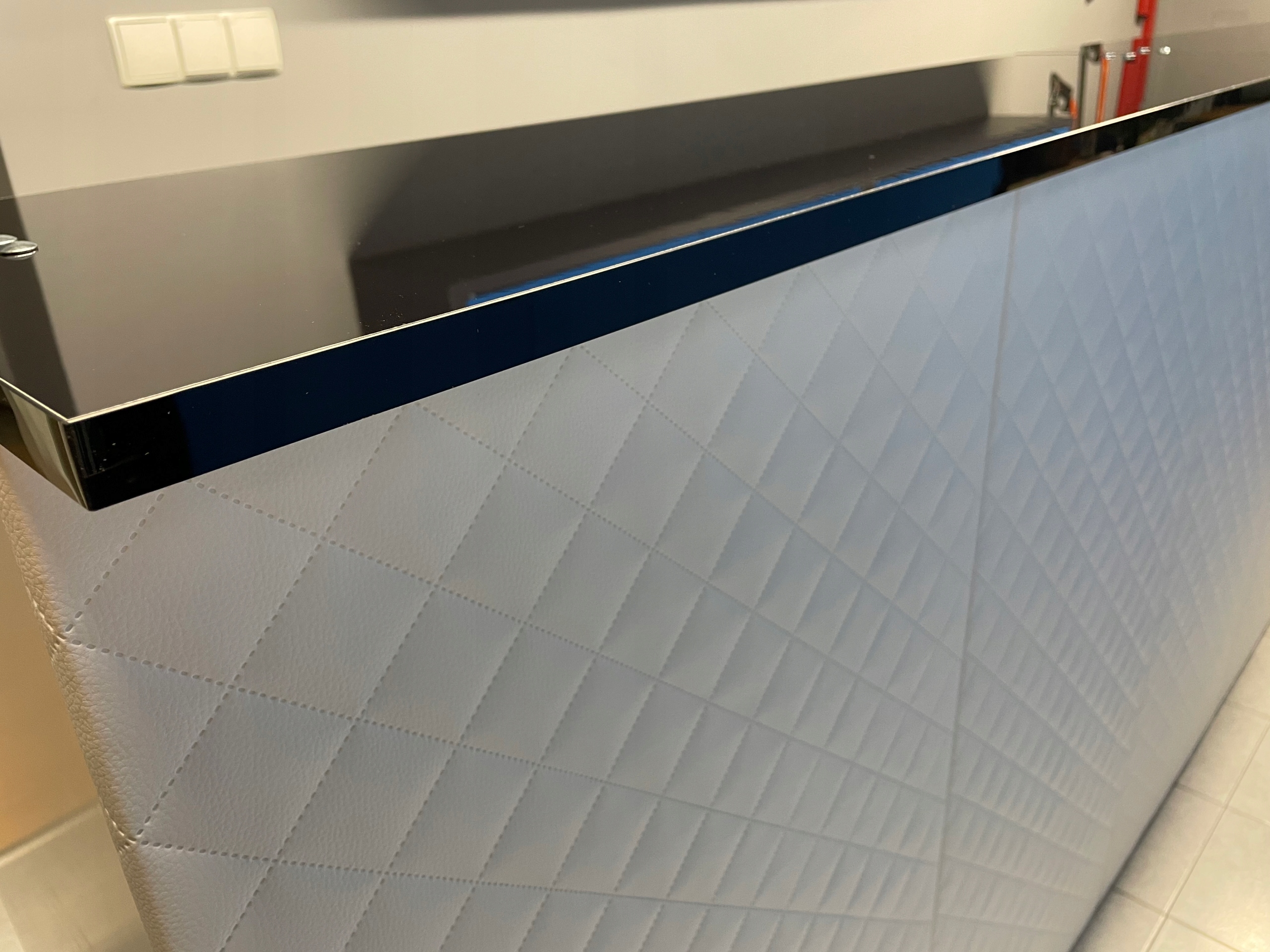 передняя часть бара была покрыта эко -лицевой. Этот материал устойчив к повреждению. Это 100% пятно и водонепроницаемое. Вы можете мыть его после каждой стороны. Можно изменить цвет материала.