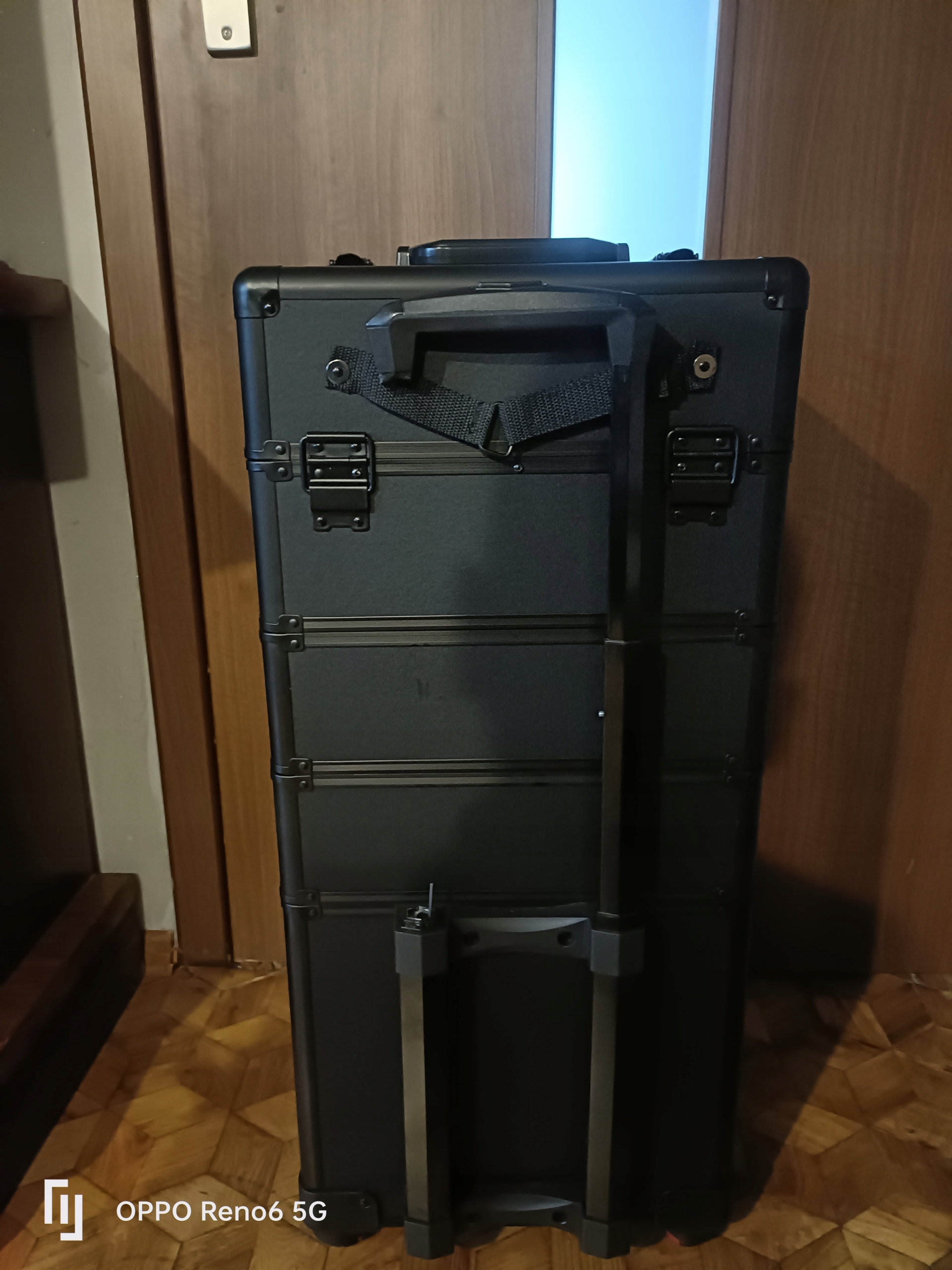 - Просторная и практическая планировка: косметолог в верхней части съемного в виде маленького чемодана, большой чемодан внизу, а между ними съемная камера с небольшими перегородками и ящиком.