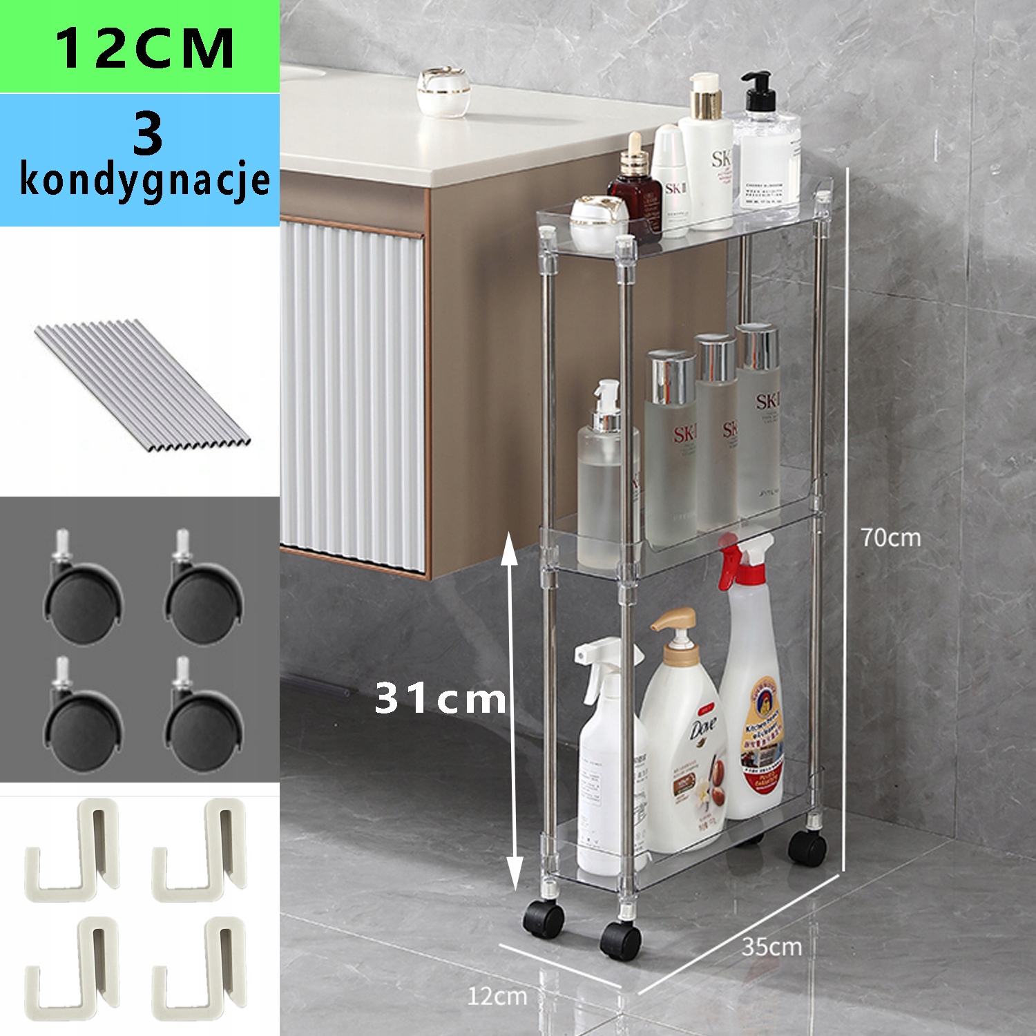 Mobilny Regał na Kółkach Wózek Kuchenny Łazienkowy Ielofunkcyjny Wąski 12CM