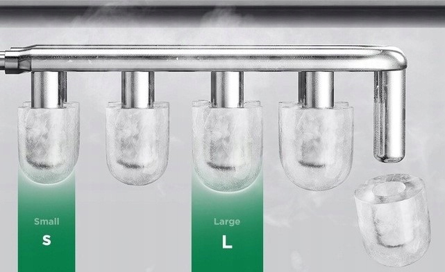 Емкость бака льдогенератора составляет 2,4 л. Размер кубиков льда можно выбрать между. "S" (маленький) и размер "L" (большой). Ледогенератор производит до 12 кг льда в сутки, т.е. 9 кубиков за цикл длительностью 6-13 минут, в зависимости от выбранного размера кубика.