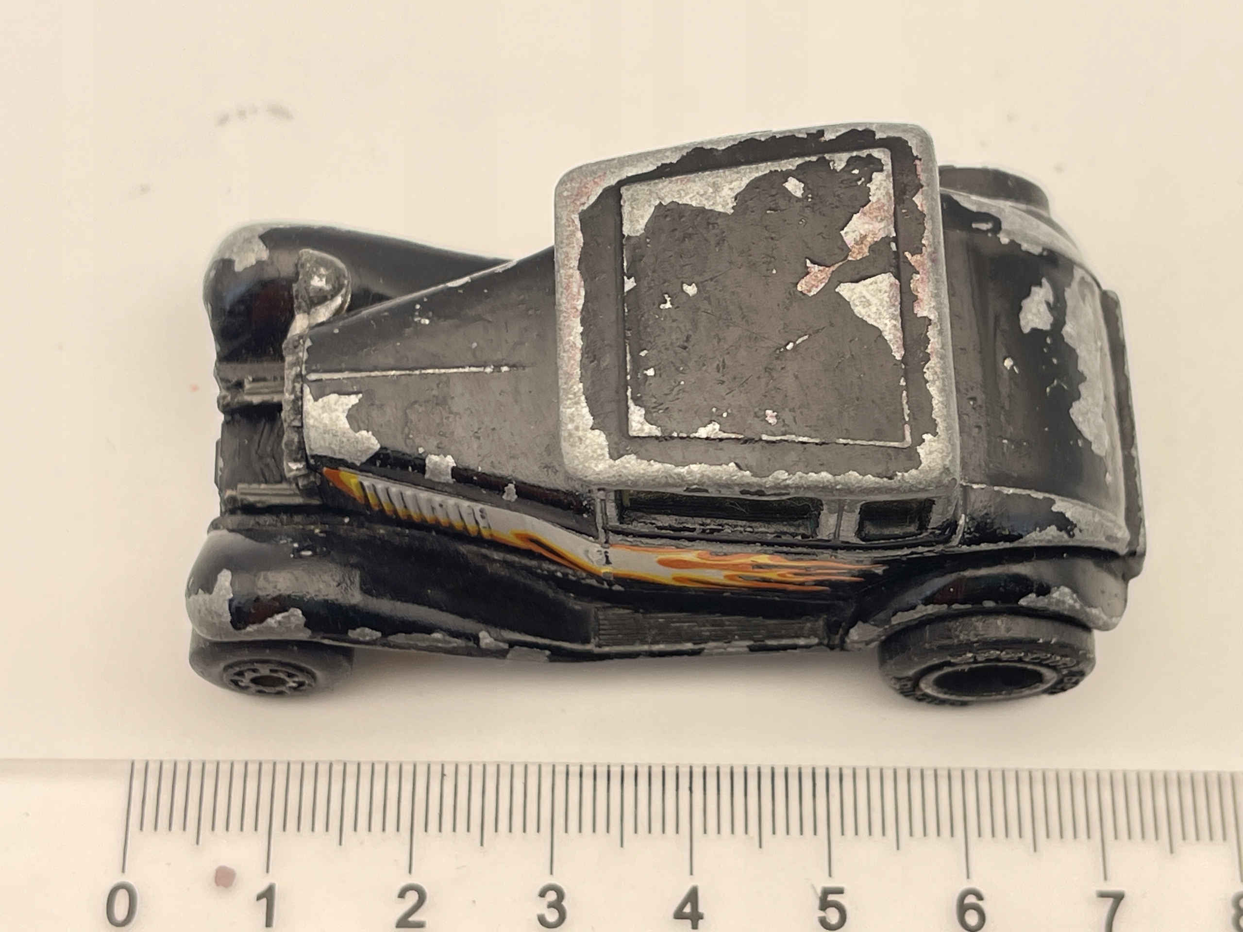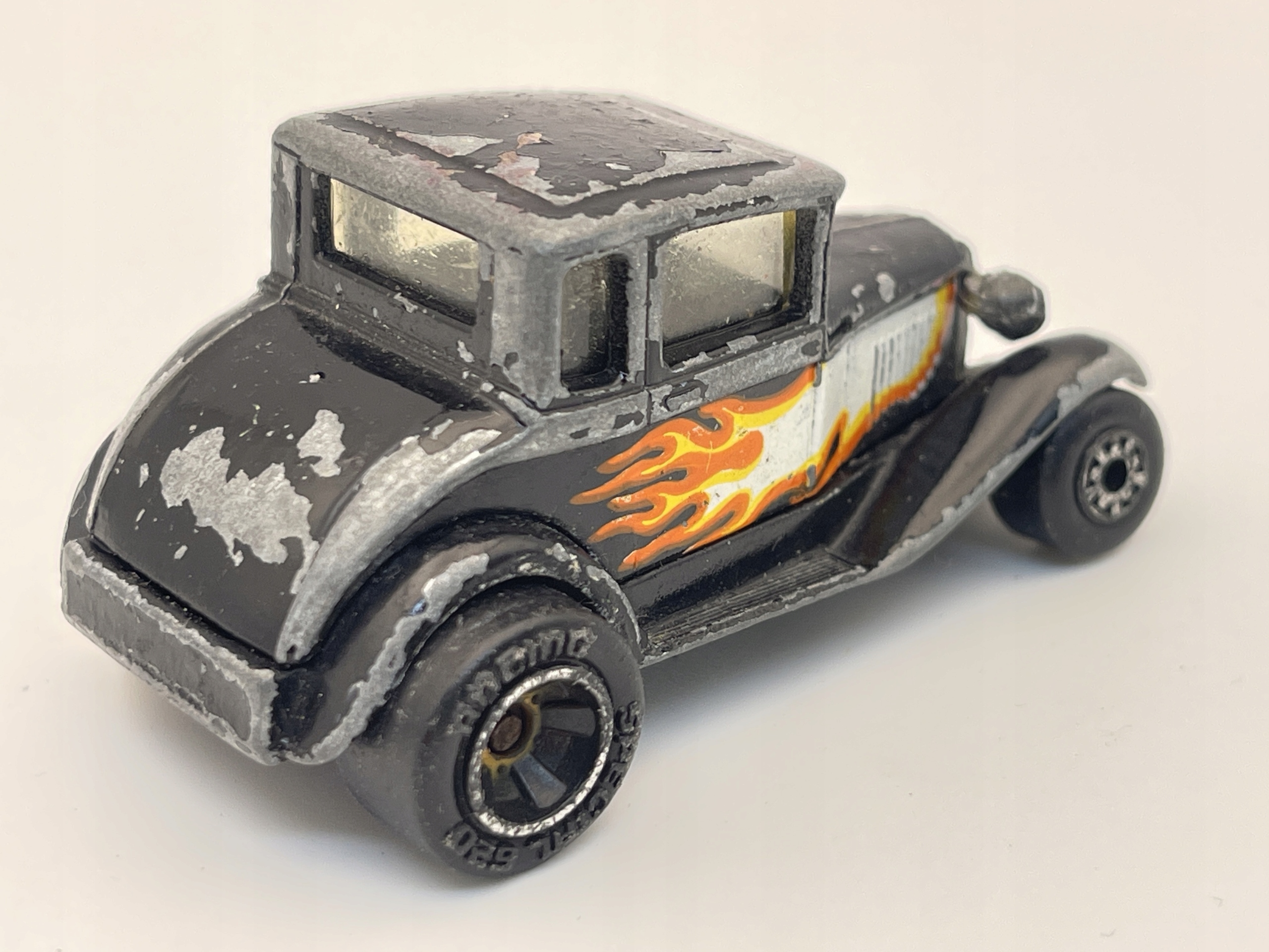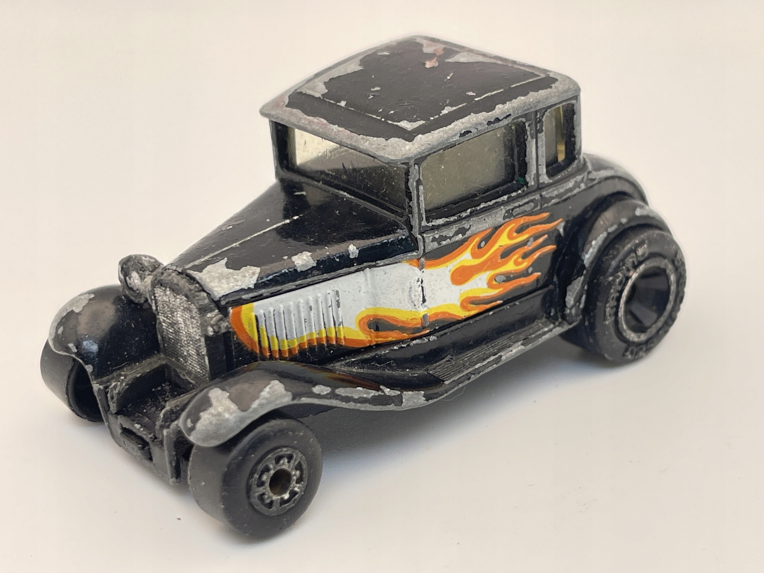 Этой весной — классический Ford Model A в масштабе 1:64. Черный цвет, дополненный языками пламени по бокам, привлекает внимание коллекционеров, а металлическая конструкция обеспечивает долговечность. Несмотря на видимые следы использования, такие как царапины и сколы краски, модель сохраняет свой шарм и солидность, свойственные игрушкам 1970-х годов.